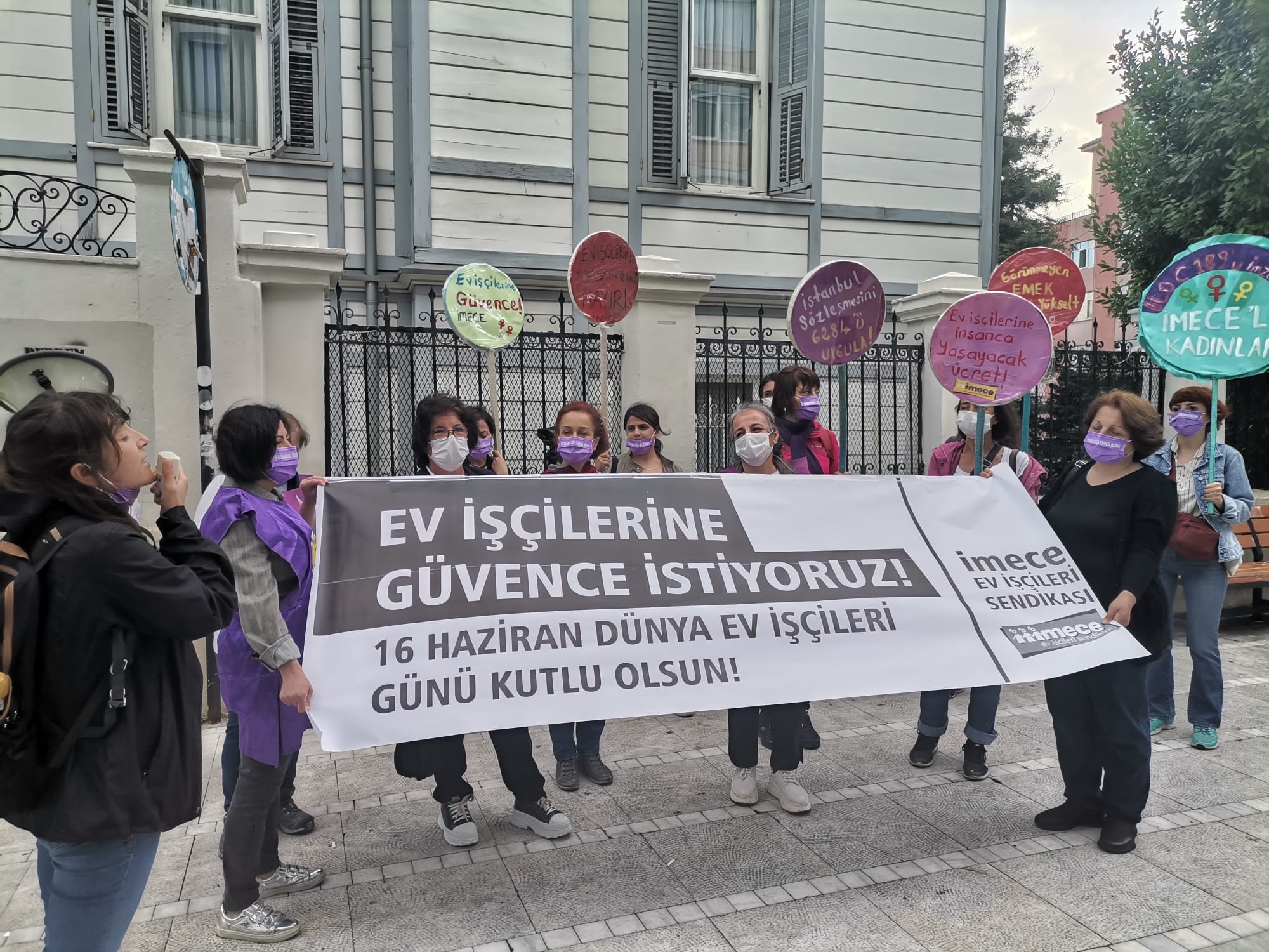 16 Haziran Dünya Ev İşçileri Günü nedeniyle güvence talebinde bulunan İmece Ev İşçileri Sendikası, İstanbul, Bursa ve Antalya’da eylem yaptı.