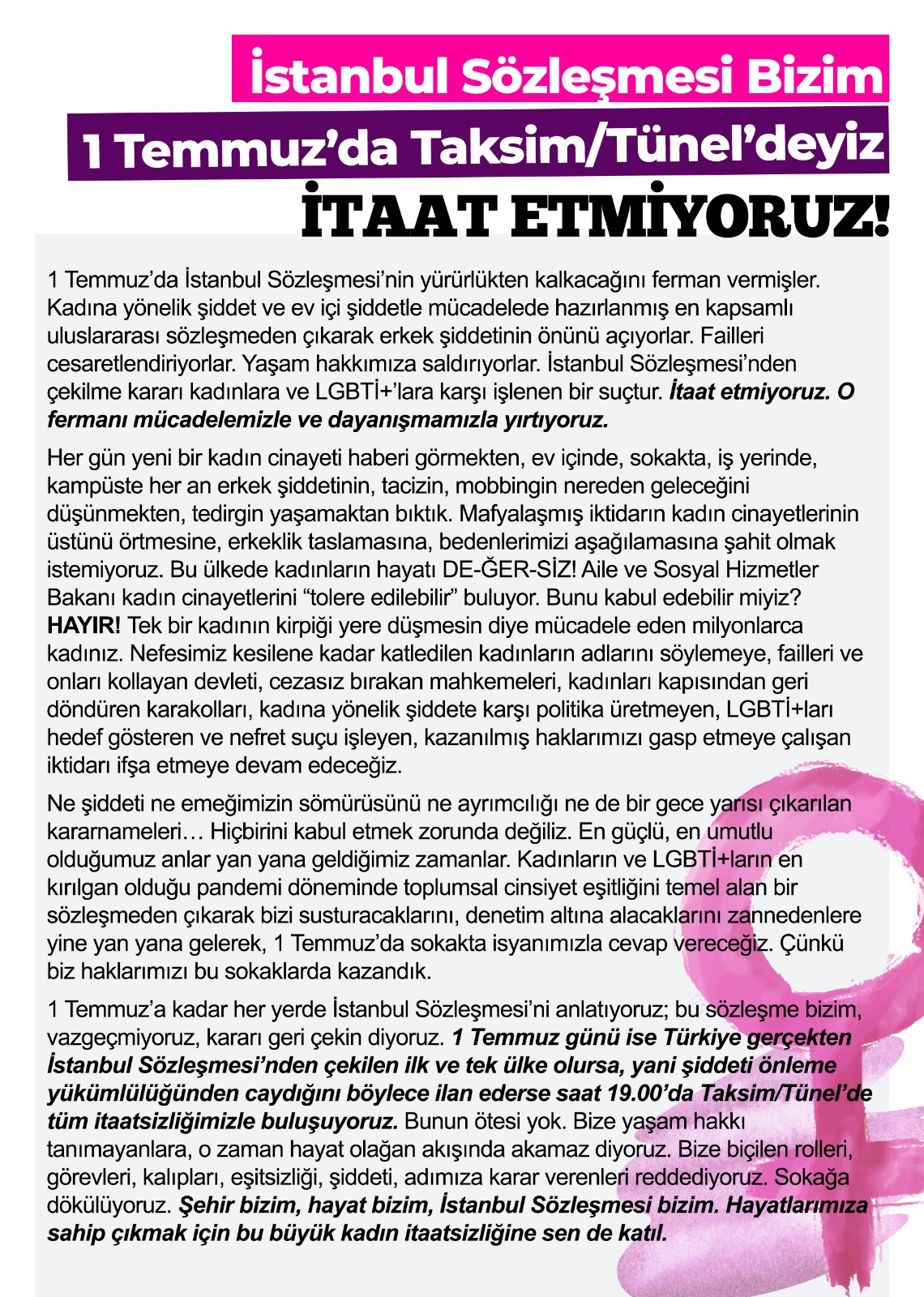 Bugün (9 Haziran) Nahide Opuz kararının yıldönümü. Nahide Opuz kararının yıldönümünde İstanbul Sözleşmesi’nin mihenk taşı olduğunu hatırlatan kadınlar ve LGBTİ+’lar “1 Temmuz’a kadar her yerde İstanbul Sözleşmesi’ni anlatıyoruz; sözleşme bizim, vazgeçmiyoruz, kararı geri çekin diyoruz. 1 Temmuz günü ise Türkiye gerçekten İstanbul Sözleşmesi’nden çekilen ilk ve tek ülke olursa, yani şiddeti önleme yükümlülüğünden caydığını böylece ilan ederse saat 19.00’da Taksim/Tünel’de tüm itaatsizliğimizle buluşuyoruz. Bunun ötesi yok. Biz kadınlara ve LGBTİ+lara yaşam hakkı tanımayanlara diyoruz ki; o zaman hayat kimse için olağan akışında akamaz. Bize biçilen rolleri, görevleri, kalıpları, eşitsizliği, şiddeti, adımıza karar verenleri reddediyoruz. Sokağa dökülüyoruz. Haklarımız bizim, hayat bizim, İstanbul Sözleşmesi bizim. Hayatlarımıza birlikte sahip çıkmak için haydi sokağa!” dedi. Hem 19 Haziran’daki büyük kadın mitingine hem de 1 Temmuz’da Taksim Tünel’e çağrı yapan kadınlar ve LGBTİ+’lar yaptıkları görseller ile çağrı metinlerini paylaştı.