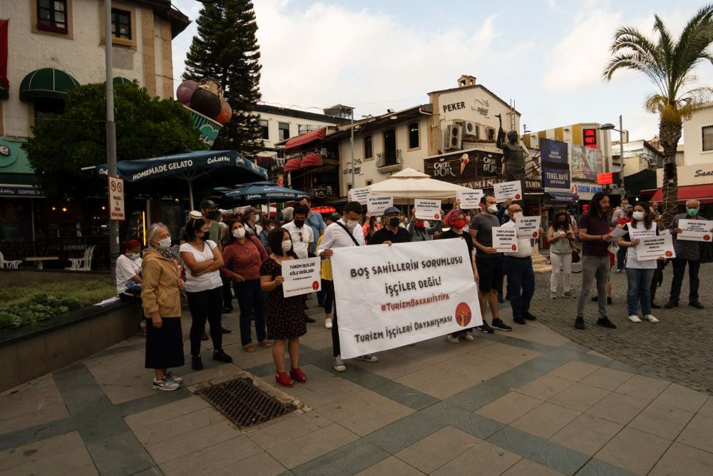 Turizm İşçileri Dayanışması, Antalya’da yaptıkları basın açıklamasıyla pandemi sürecinin kötü yönetilmesi sonucu turizm sezonunun açılamamasından kaynaklı ekonomik olarak zor durumda olduklarını belirterek koşulsuz şartsız destek istedi
