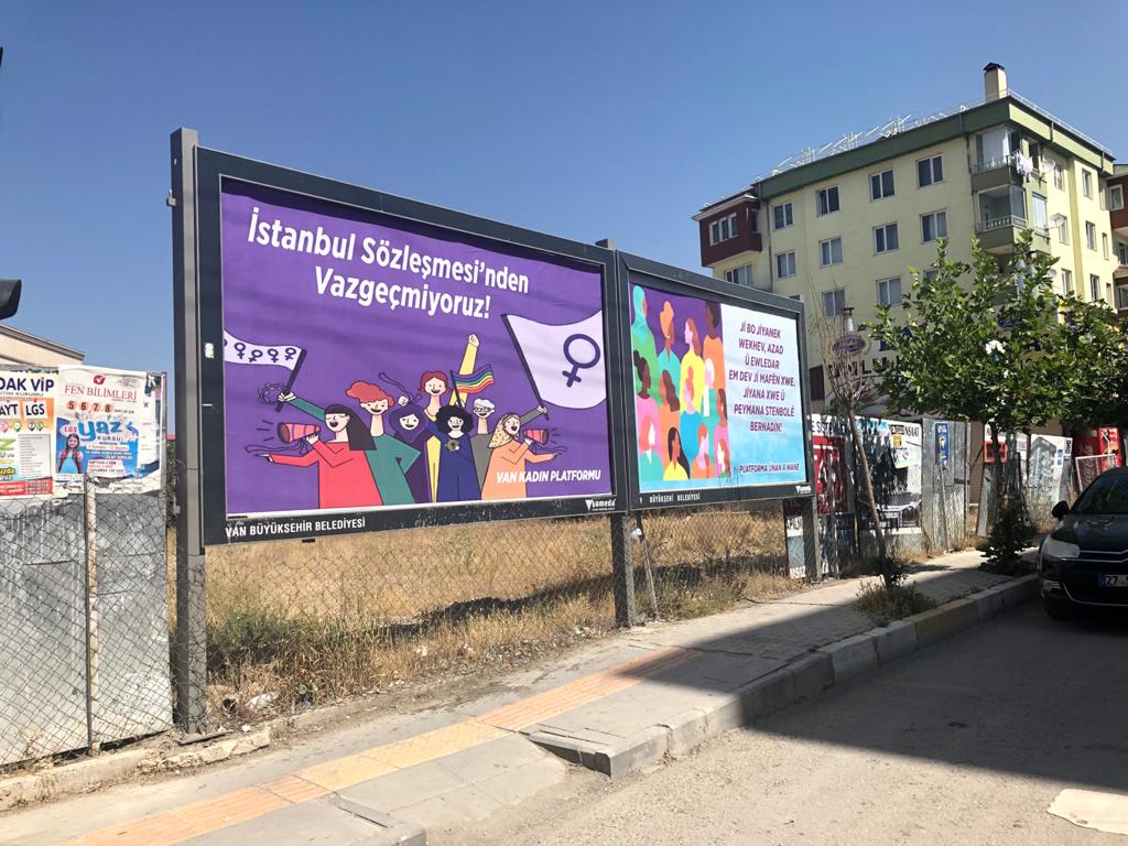 Çekilme kararına tepki gösteren Van Kadın Platformu da kentin farklı yerlerinde bulunan bilboardlara Kürtçe ve Türkçe “İstanbul Sözleşmesi yaşatır” afişleri astı.