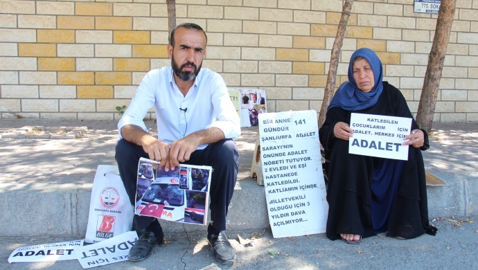 AKP Milletvekili İbrahim Halil Yıldız’ın koruma ve yakınlarının saldırısı sonucu eşi ve iki oğlunu yitiren Emine Şenyaşar ile saldırıdan yaralı kurtulan oğlu Ferit Şenyaşar’ın Urfa Adliyesi önünde 9 Mart tarihinde başlattıkları “Adalet” nöbeti devam ediyor. Sabahın erken saatlerinde adliye binası önüne yerleştirilen beton blokların önüne gelen anne ve oğlu, yere bıraktıkları “Herkes için adalet”, “Bir anne 141 gündür Urfa Adalet Sarayı önünde adalet nöbeti tutuyor. 2 evladı ve eşi hastanede katledildi, katliamın içinde milletvekili olduğu için 3 yıldır dava açılmıyor” yazılı dövizlerle nöbeti başlattı.