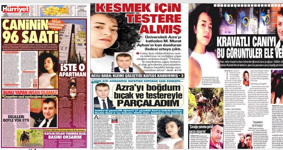 Akşam, Hürriyet, Sabah, Sözcü gazetelerinin yanı sıra Karar ve Milliyet gazetelerindeki haberlerde de cinayetle ilgili olarak katilin ifadesinden alınmış kanlı ayrıntılar yer alıyordu. Boğulma, bıçak, testere, parça parça edilen genç kadının evden taşınması, çalılıklara atılması…Aynı vahşi ifadeler, Habertürk, CNN Türk, İnternethaber, VeryansınTV, Yeni Akit, Takvim, Haber Global gibi onlarca internet sitesinde de tekrarlandı; izlemedim ama muhtemelen televizyonlarda da aktarılmıştır.