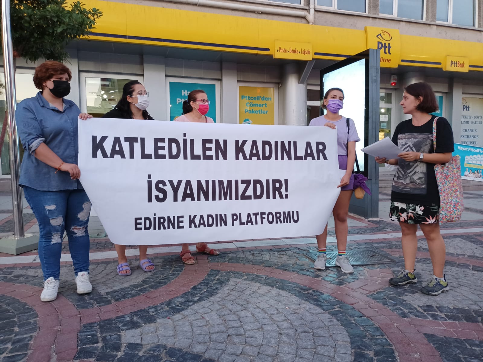 Edirne Kadın Platformu’nun çağrısıyla Edirne Merkez’de Saraçlar Caddesi üzerinde bulunan PTT önünde saat 20.30’da bir araya gelen kadınlar basın açıklaması yaptı. “Katledilen kadınlar isyanımızdır” pankartının açıldığı eylemde “Geceleri de sokakları da meydanları da terk etmiyoruz” sloganı atıldı.