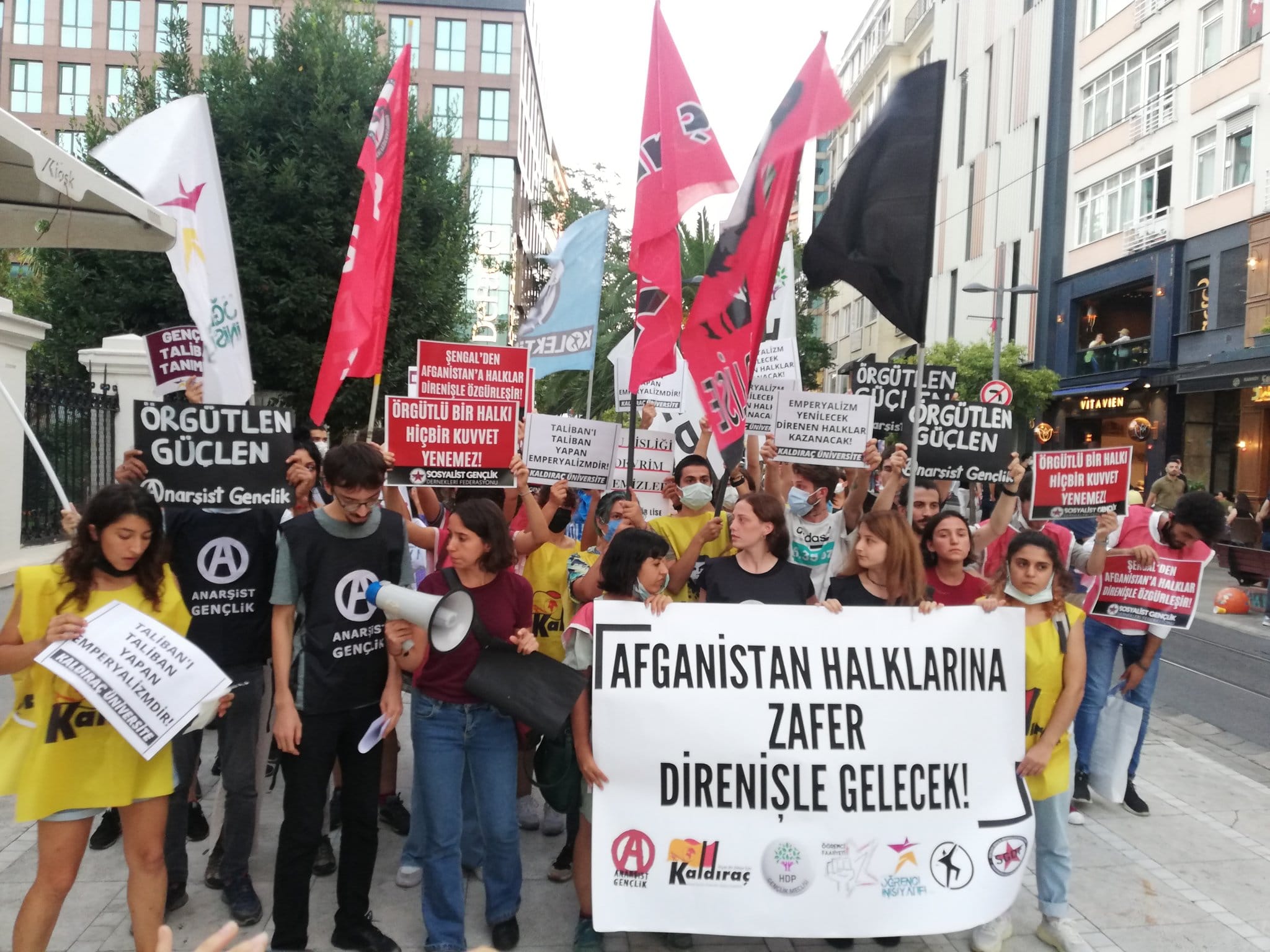 “Afganistan halklarına zafer direnişle gelecek” yazılı pankartın açıldığı eylemde sık sık, “Afgan halkı yalnız değildir”, “Örgütlü bir halkı hiçbir kuvvet yenemez” ve “Gençliğin dayanışması sınırları aşıyor” sloganları atıldı.