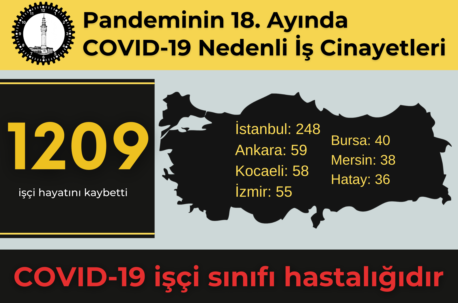 İşçi Sağlığı ve İş Güvenliği Meclisi, pandeminin ortaya çıkmasından bugüne COVID-19 kaynaklı iş cinayetlerinin raporunu çıkardı. İSİG Meclisi’nin raporuna göre 11 Mart 2020-10 Eylül 2021 arasında en az 1209 işçi COVID-19 sebebiyle yaşamını yitirdi