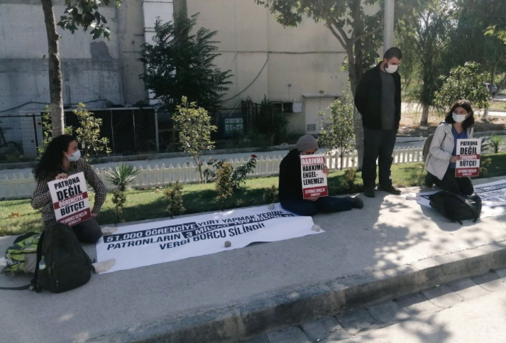 “51000 öğrenciye yurt yapmak yerine patronların 3 milyar TL vergi borcu silindi” yazılı bir pankart açıp, “Patrona değil öğrenciye bütçe” yazılı dövizler taşıyan ve “Parasız eğitim, parasız barınma” sloganı atan dört üniversiteli gözaltına alındı.