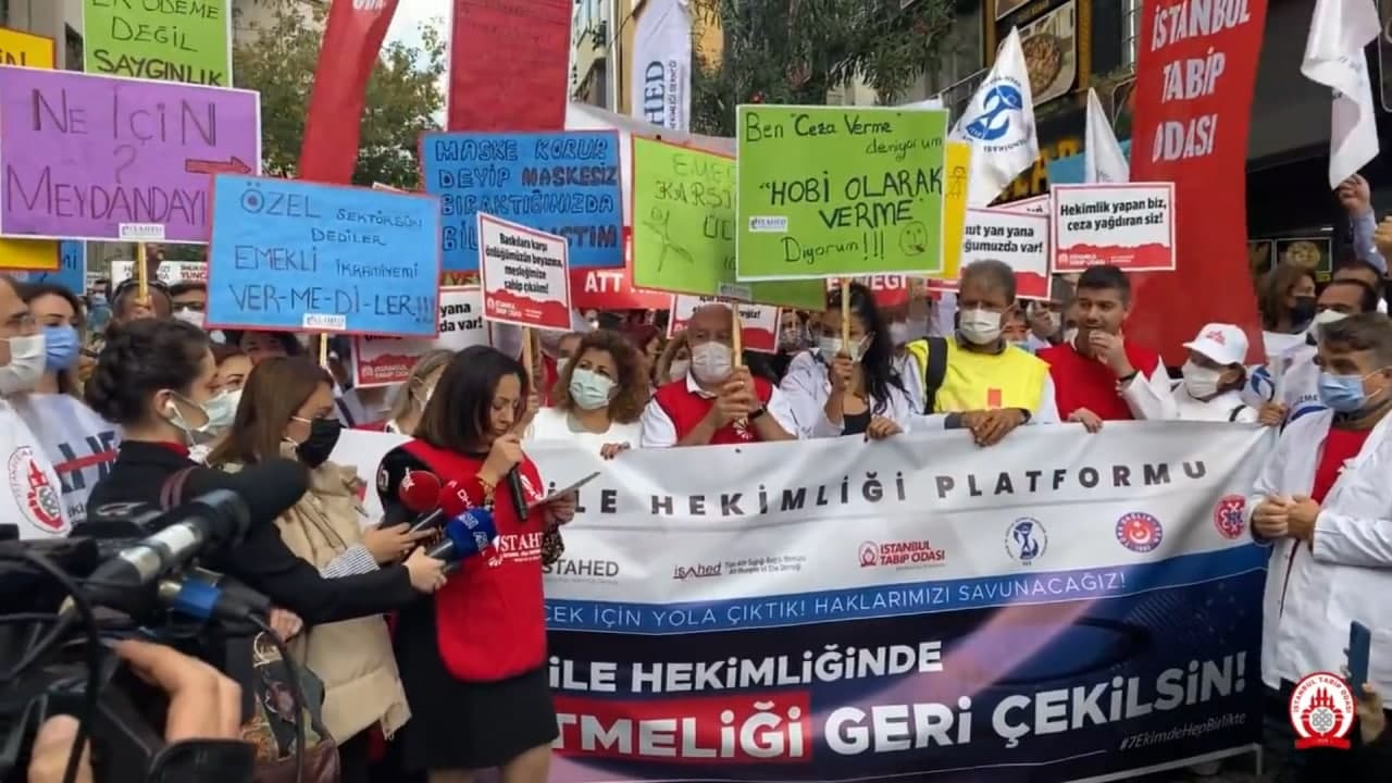 Aile Hekimliği Sözleşme ve Ödeme Yönetmeliği’ne karşı hekimler Ankara ve İstanbul’da iş bıraktı. Yeni yönetmeliği ceza yönetmeliği olarak adlandıran hekimler aşı karşıtlarına izin verdiği halde hekimlerin mitingine izin vermeyen İstanbul Valiliğine de tepki gösterdi
