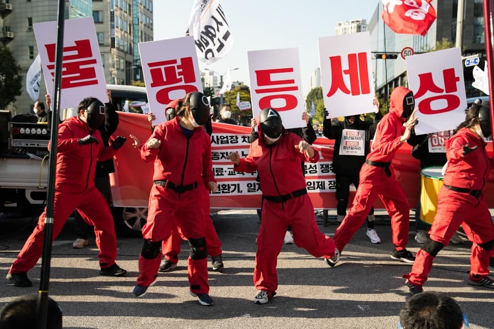 Greve katılan işçiler arasında Güney Kore’de geçen, eşitsizliğin ve borçluluğun toplum üzerindeki etkisine dikkat çeken popüler dizi olan Squid Game’de kullanılan kıyafetlerini giyenler de vardı.