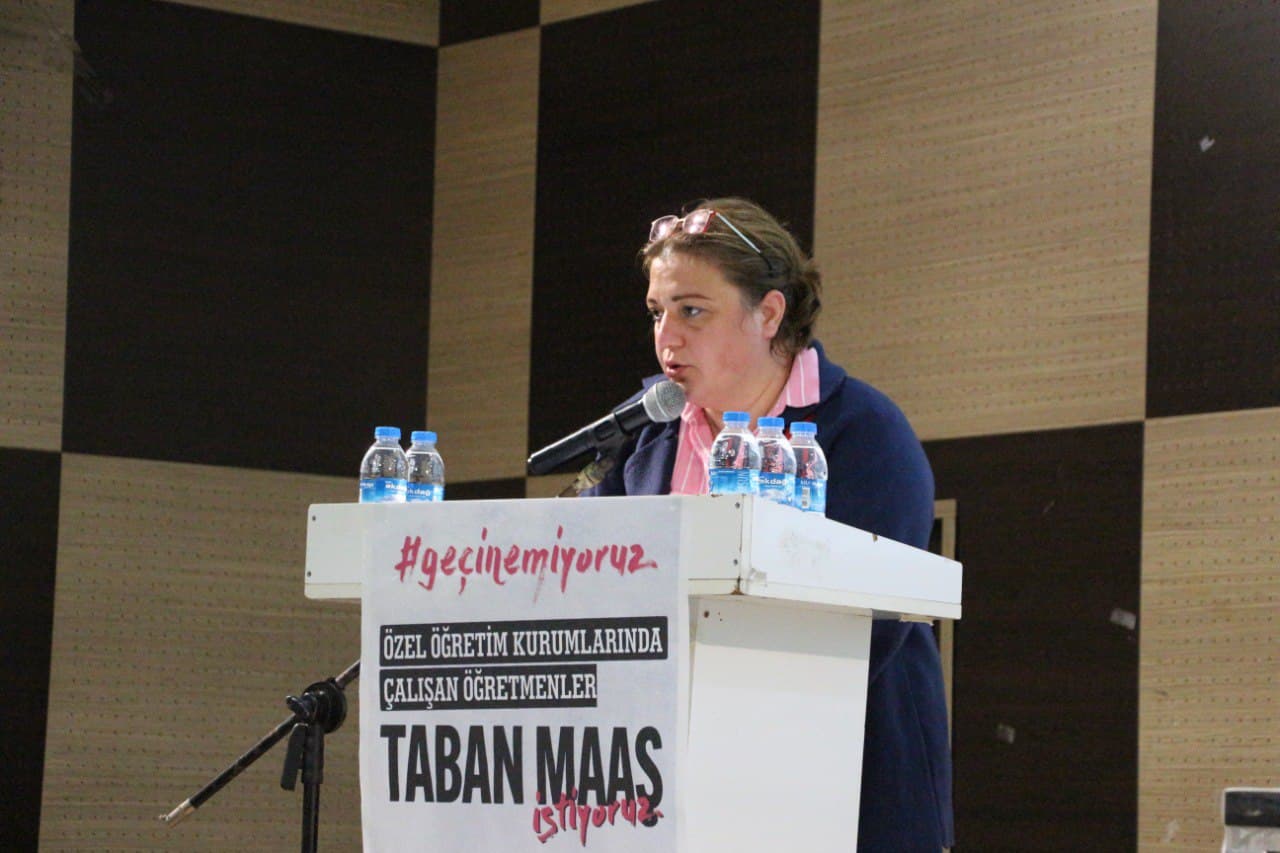 Efil’in ardından söz, sendika üyelesi öğretmenlerden Ceren Biçer’indi. Biçer ise kadın öğretmenlerin yaşadığı sorunlara değindi. Emek sömürüsünün yüksek olduğu bir alanda bir kez daha ezildiklerini vurgulayan Biçer, yaptıkları makyajdan giydikleri kıyafetlere kadar fiziksel görünüşleri üzerinden çok baskı gördüklerini ifade etti. Aynı işi yapmalarına rağmen ücret almaya gelindiğinde her işte olduğu gibi bu işte de cinsiyetçi bir tutumla erkek öğretmenlerden daha az ücret aldıklarını söyleyen Biçer, pek çok kadın öğretmenin işini kaybetmemek için çocuk doğurmaktan dahi vazgeçtiğini belirtti.