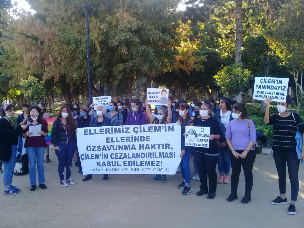 Hatay Kadınlar Birlikte Güçlü’nün çağrısıyla Büyük Antakya Parkı’nda düzenlenen eylemde “Ellerimiz Çilem’in ellerinde, özsavunma haktır! Çilem’in cezalandırılması kabul edilemez!” yazılı pankart açıldı.