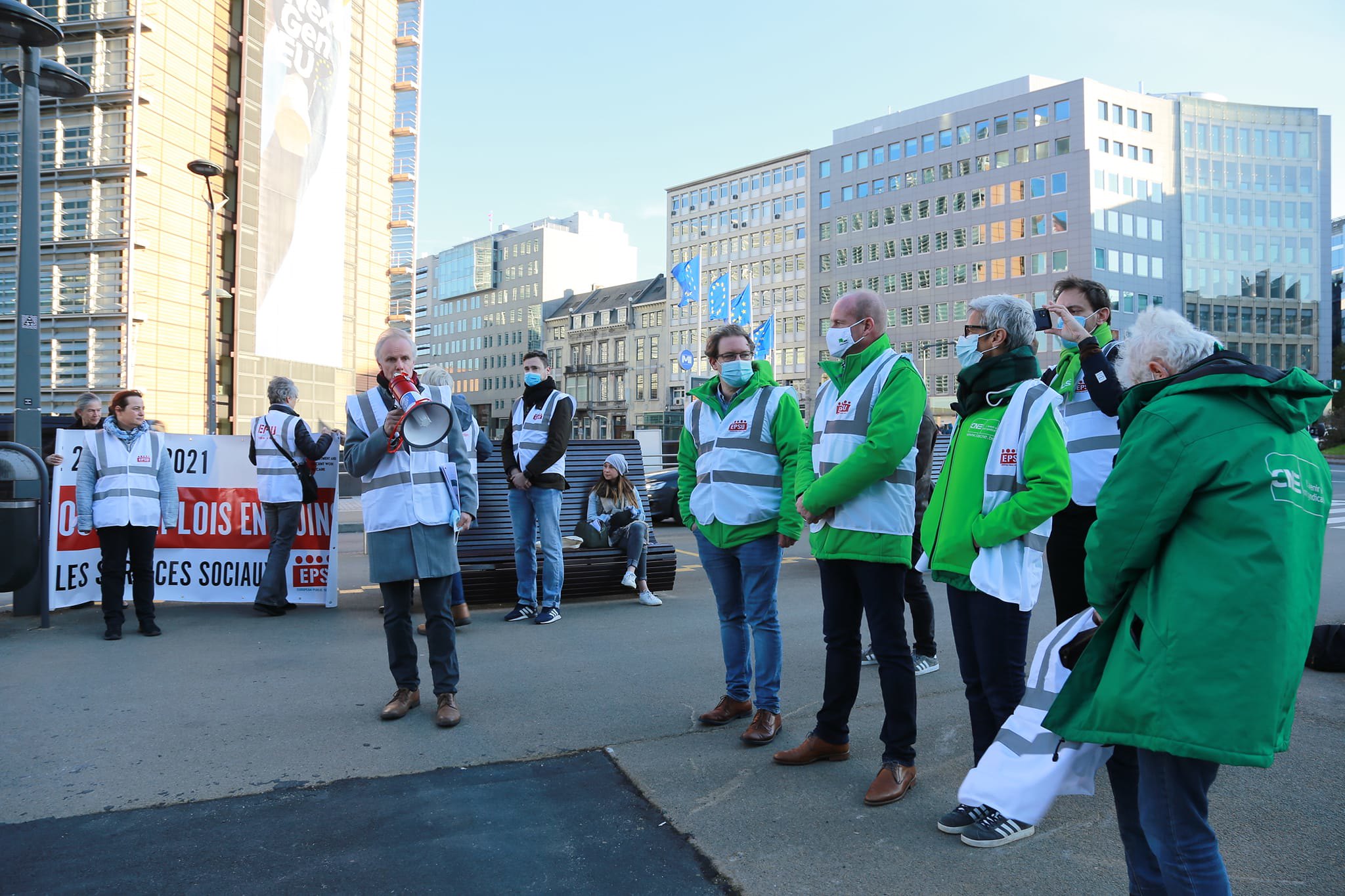 EPSU Genel Sekreteri Jan Willem Goudriaan, Parlamento önünde yaptığı konuşmada halihazırda kötü koşullarda çalışan bakım işçilerinin çalışma koşullarının pandemi ile daha da ağırlaştığına dikkat çekti.