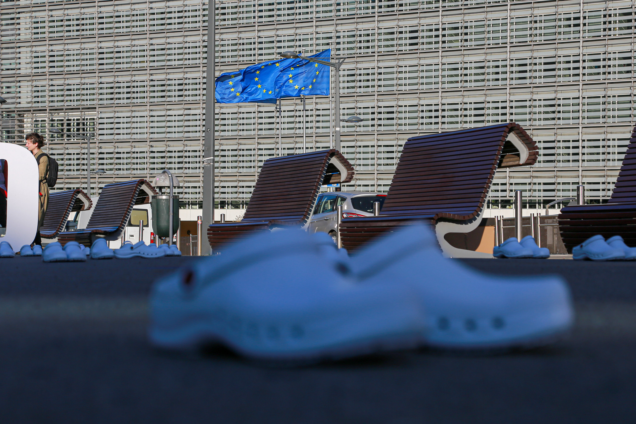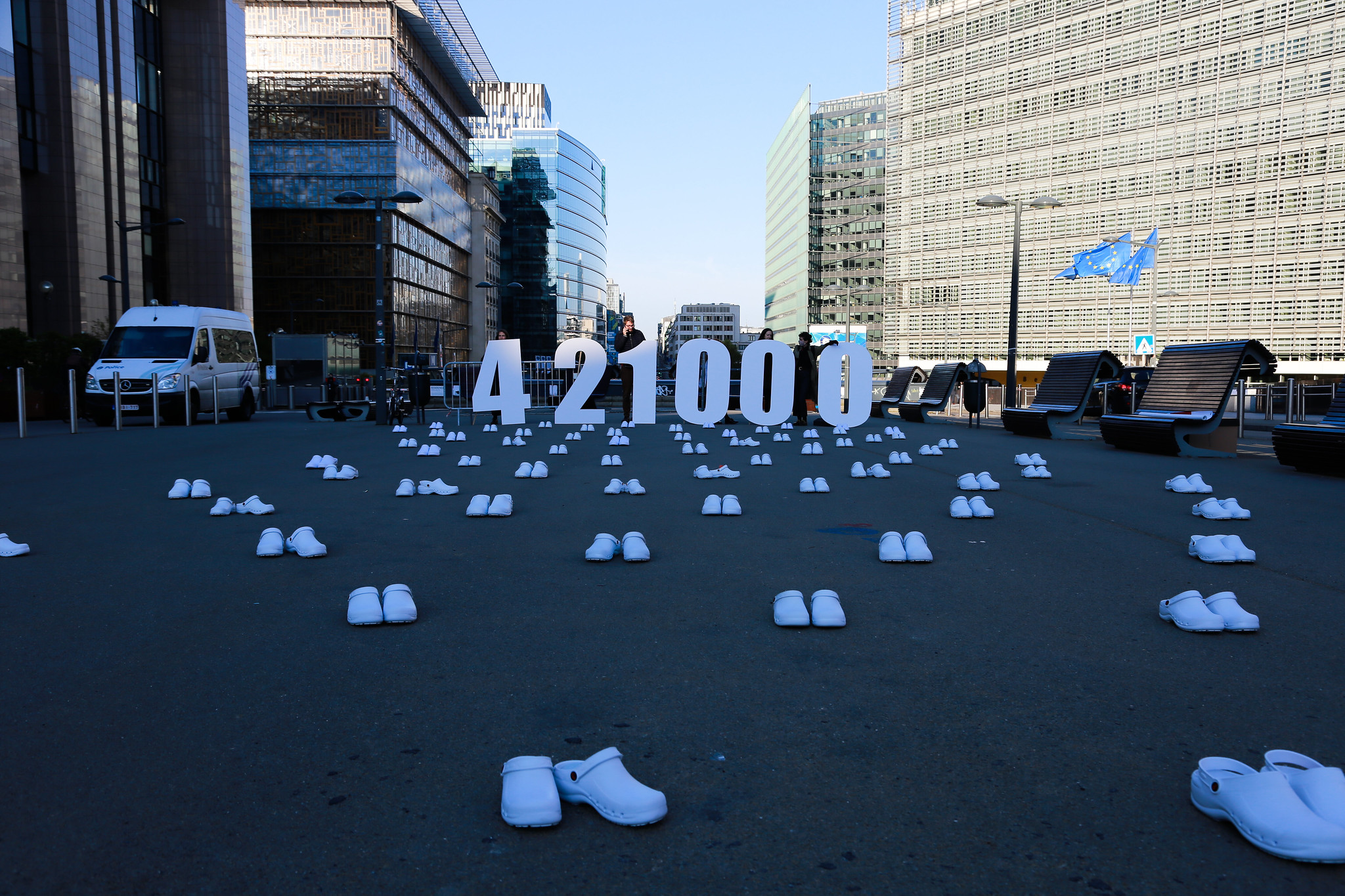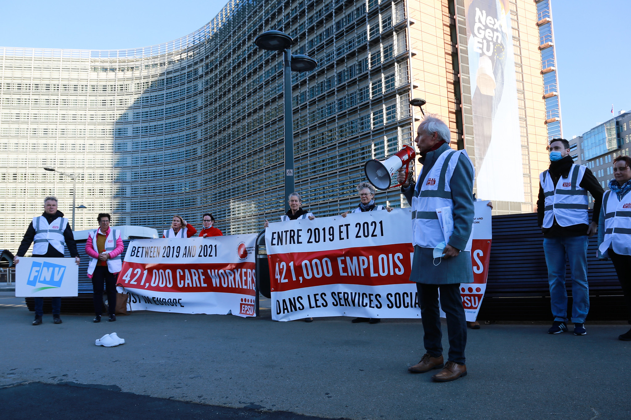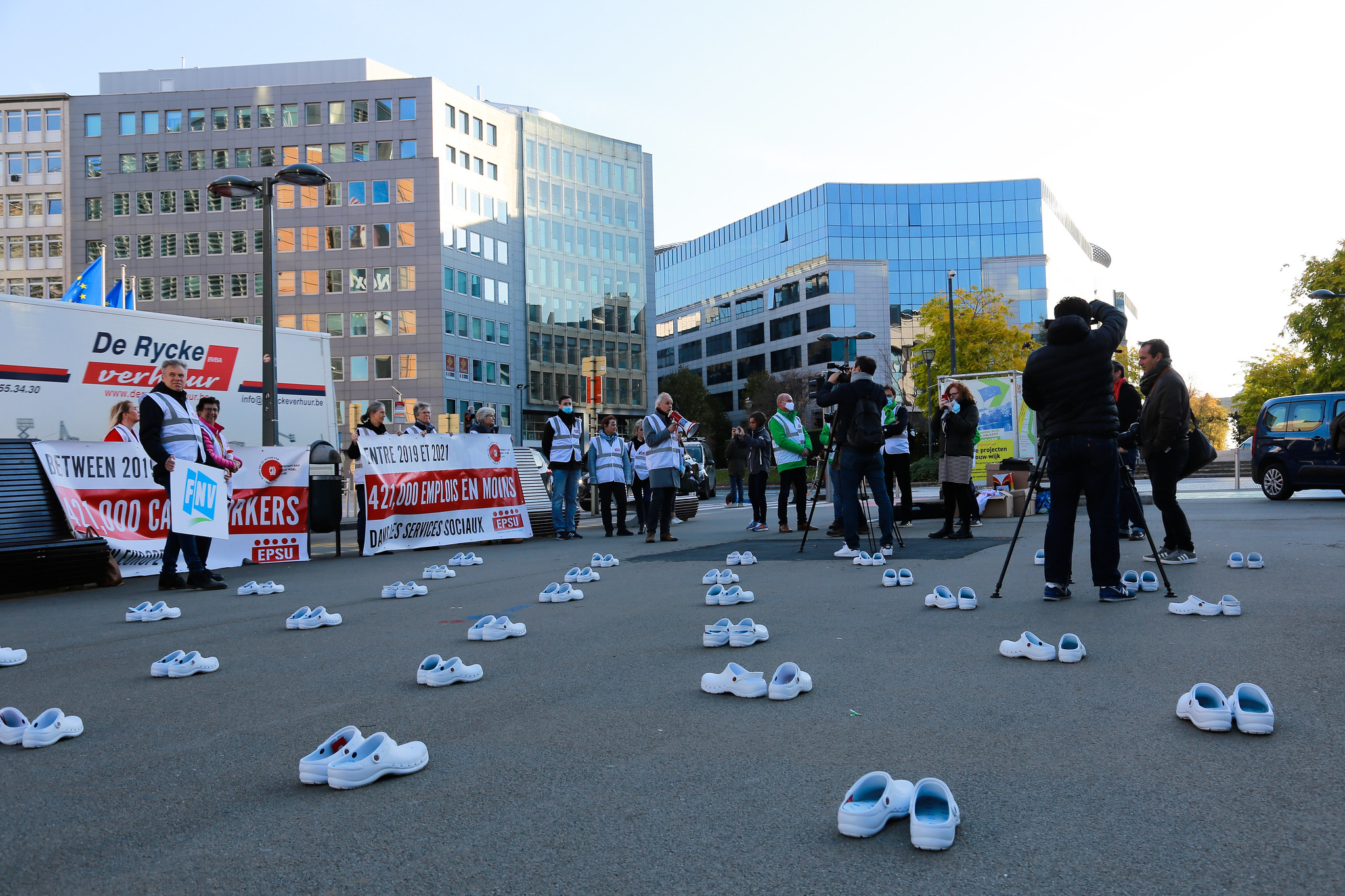 EPSU üyesi sendikalardan gelen bakım işçilerinin oluşturduğu bir delegasyonun da katıldığı eylemde, son iki yılda mesleği bırakan 421 bin bakım işçisini temsil eden onlarca beyaz hastane terliği Parlamento önüne bırakıldı.