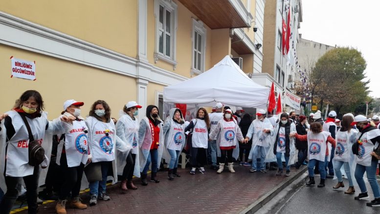 Bakırköy Belediyesi’nin önünde gerçekleşen greve baktığınızda ilk önce kadın işçilerin yoğunluğu dikkatinizi çekiyor. Biri çay demliyor, biri halayın başını tutuyor. Biri gelenleri karşılıyor. Biri arka arkaya sloganları birbirine katıyor. Bizler de kadın işçilerin yaşam gailelerini ve grevden beklentilerini merak ettik ve kadın işçilerle yaptığımız söyleşide zorlu çalışma koşullarından, toplu sözleşme mücadelelerine, cinsiyet eşitsizliklerinden, düşük ücretlere, sendikaların kadın politikalarından, bir kamu hizmeti olarak belediyelerin nasıl olması gerektiğine kadar pek çok çerçevede sorularımıza cevap aldık. Duyduklarımız, öğrendiklerimiz sadece biz de kalmasın diyerek işçiden işçiye uzanan yolda deneyim aktarımına dönüşmesi için oluşturduğumuz notları paylaşıyoruz.