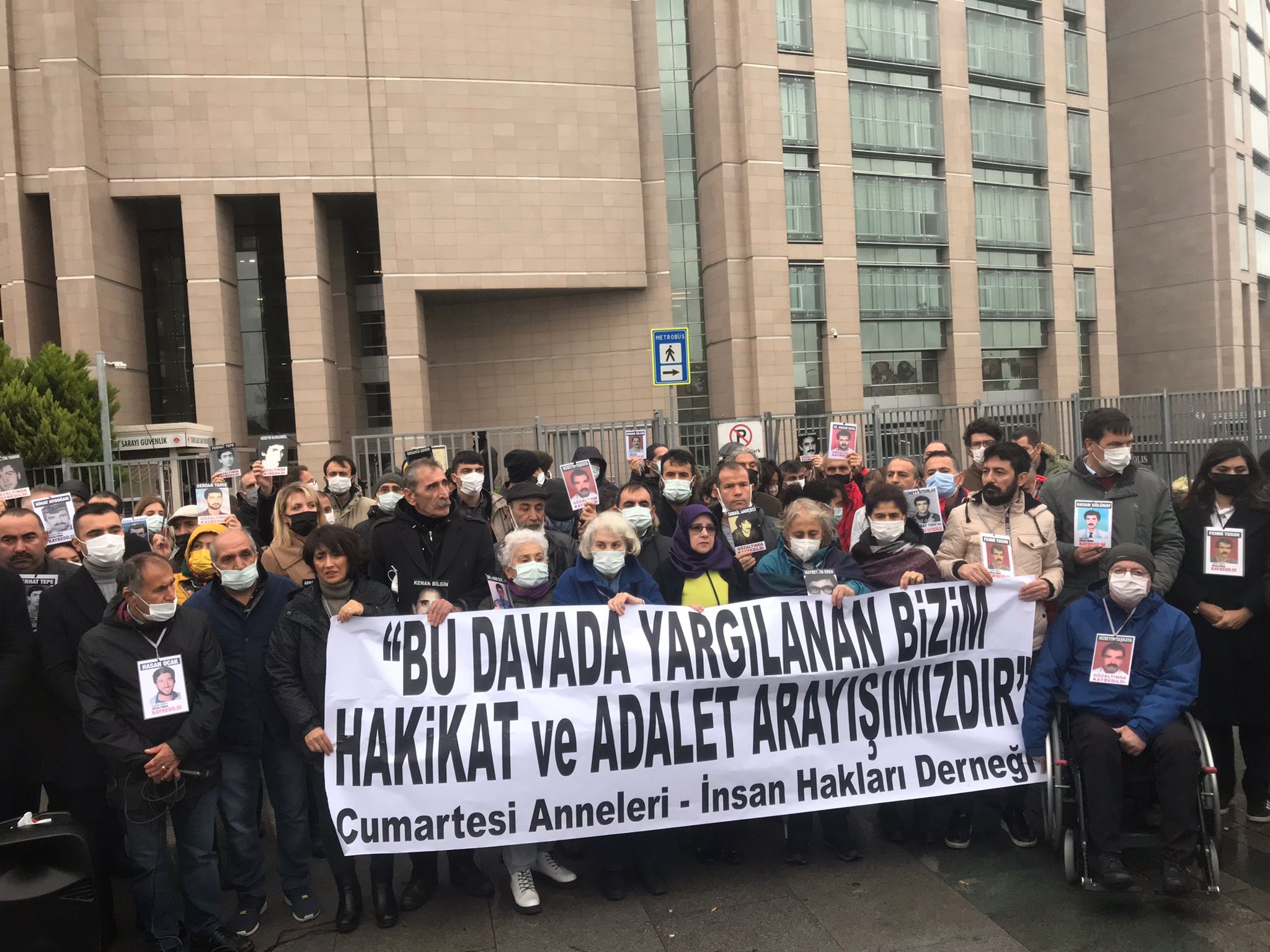 Bugün burada, üzerinde “Adalet” yazan bu binada bir yargılama yapılacak. Kim yargılanacak peki? Gözaltında kaybetmeyi bir devlet politikası haline getiren; siyasetçi, kamu görevlisi kılığına girmiş “insanlığa karşı suç” failleri mi nihayet yargılanmaya başlandı? Hayır.