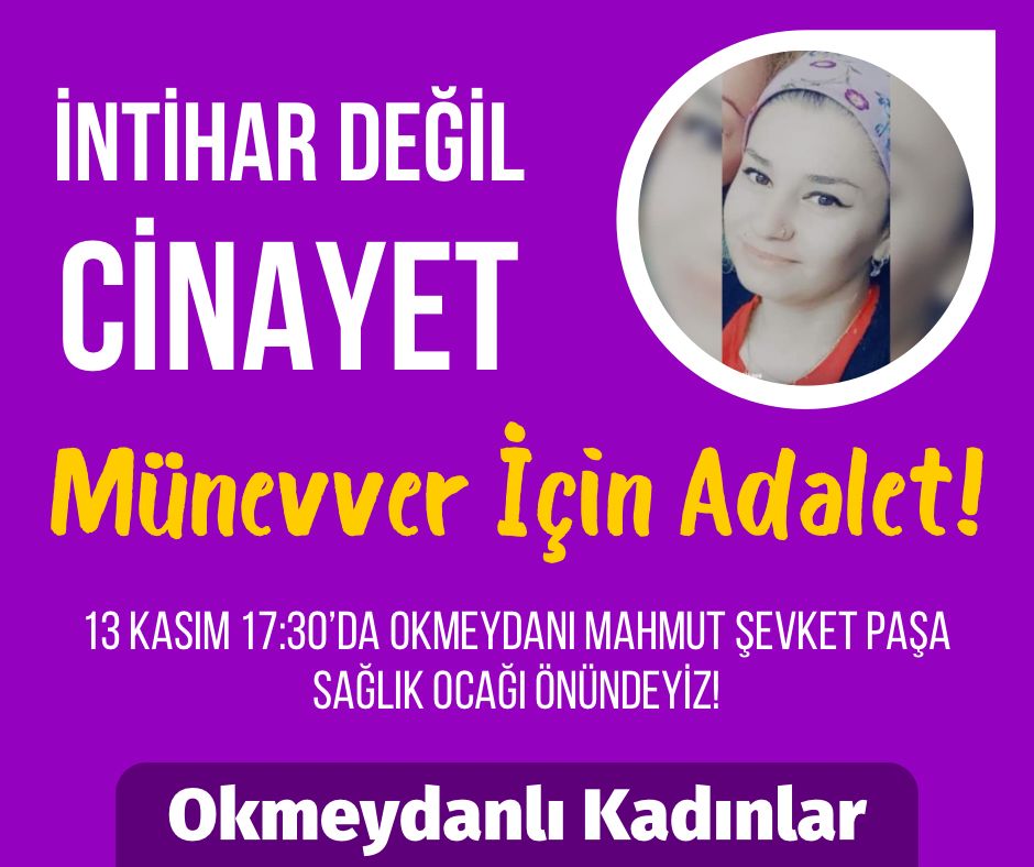 Yaşanan olayın ardından duruma tepki gösteren Okmeydanlı kadınlar, “İntihar değil, cinayet” dedi. “Kadınlar Münevver için adalet” diyerek 13 Kasım Cumartesi günü saat 17.30’da Okmeydanı Mahmut Şevket Paşa Sağlık Ocağı önünde olacaklarını duyurdu.