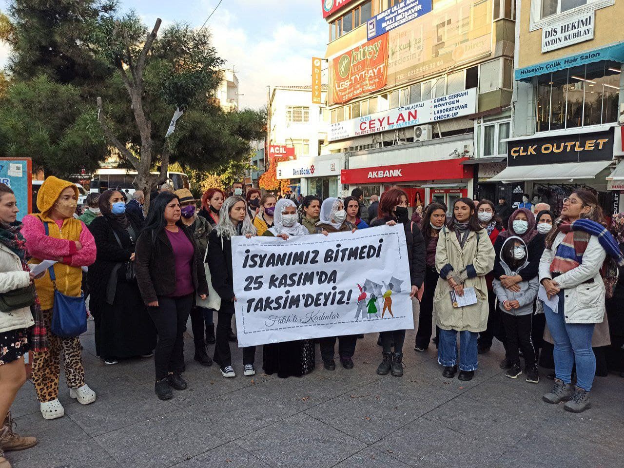 “Sokaklarda, işyerlerinde, kampüslerde bizleri tehdit edenlere karşı 25 Kasım’da Taksim’de olacağız. Kadınların şiddete, tacize, çocuk istismarına karşı büyüttüğü sesi bugün Fatih’ten, 25 Kasım’da da Taksim’de ve Türkiye’nin dört yanında yükselteceğiz” denilen açıklamanın ardından, 25 Kasım Perşembe günü, saat 19.30’da Taksim Tünel’de yapılacak eyleme katılım çağrısı yapıldı.