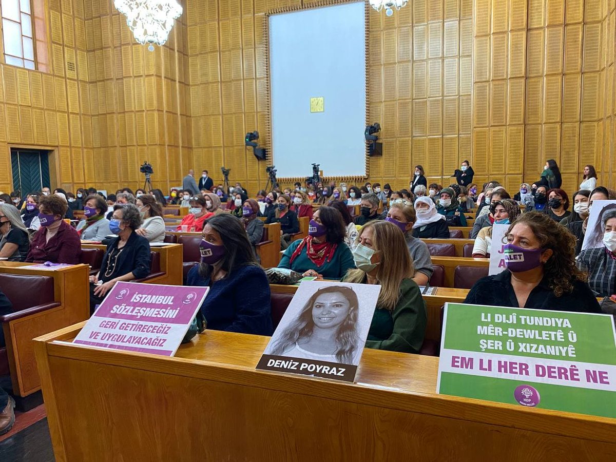 Halkların Demokratik Partisi (HDP), 25 Kasım Kadına Yönelik Şiddete Karşı Uluslararası Mücadele Günü yaklaşırken grup toplantısını kadınlarla düzenledi. Meclis’te Kadın Grubu toplantısına çok sayıda kadın örgütü katıldı. HDP sıralarında “İstanbul Sözleşmesini geri getireceğiz ve uygulatacağız”, “Jin jiyan azadî”, “Erkek-devlet şiddetine, savaşa, yoksulluğa karşı her yerdeyiz”, “Li dijî tundiya mêr-dewletê û şer û xizaniyê em li her derê ne” yazılı dövizlerin yanı sıra Deniz Poyraz’ın fotoğrafları yer aldı.