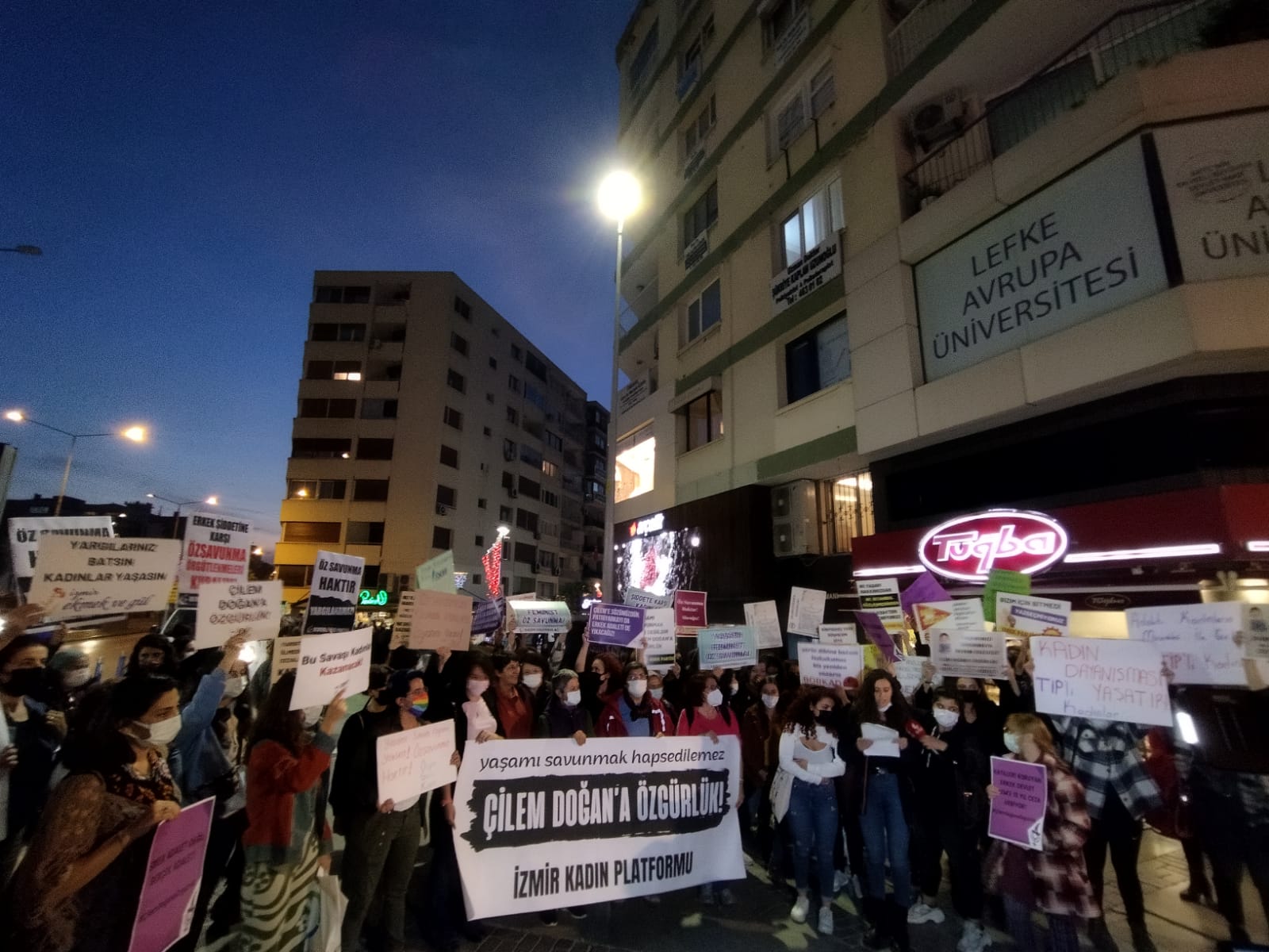 İzmir Kadın Platformu’nun çağrısıyla Alsancak Sevinç Pastanesi önünde toplanan kadınlar, basın açıklaması yaptı. Açıklamada Çilem Doğan hakkında verilen kararın Çilem nezdinde tüm kadınlara “Sen neden ölmedin” mesajının hukuk aracılığıyla verilmesi anlamı taşıdığına vurgu yapıldı.