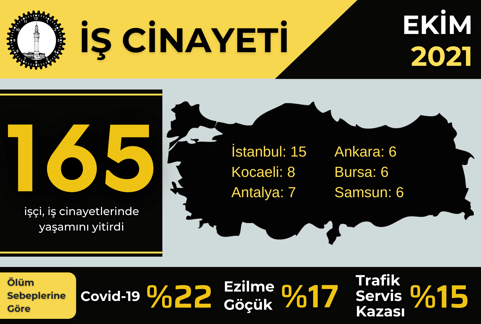 Raporda ulusal ve yerel basından toplanan verilere göre Ekim ayında 165 iş cinayeti yaşandığı belirtildi. Ekim ayındaki iş cinayetlerinin yanı sıra geçtiğimiz aylara dair veriler de sunulmakta. Sunulan verilere göre ise 2021 yılının ilk on ayında iş cinayetlerinde en az 1853 işçi yaşamını yitirdi.