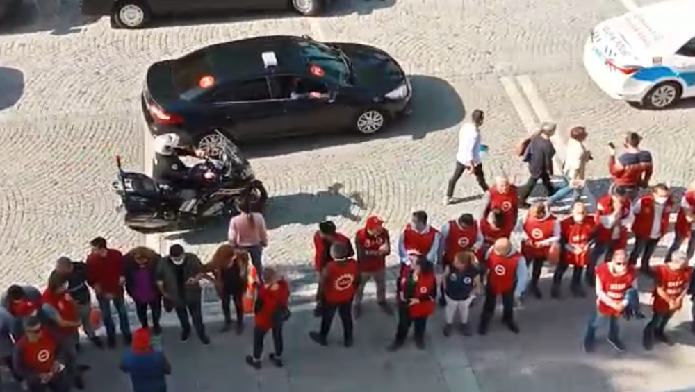 İzmir’de DİSK Genel-İş üyesi işçiler, İçişleri Bakanı Süleyman Soylu’nun konvoyunun geçtiği esnada sırtlarını dönerek alkışlar ve ıslıklar eşliğinde tepki gösterdi