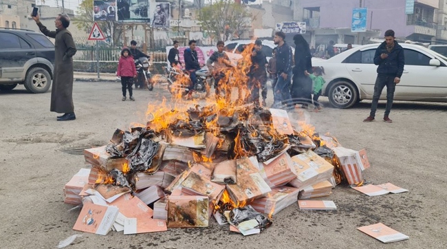 Millî Eğitim Bakanlığı tarafından hazırlatılan ve Suriye’nin kuzeyinde TSK ve cihatçı grupların kontrolündeki bölgelere gönderilen Muhammed peygamberin yaşamına dair ilkokul kitapları, görsel içermesi nedeniyle yakıldı.