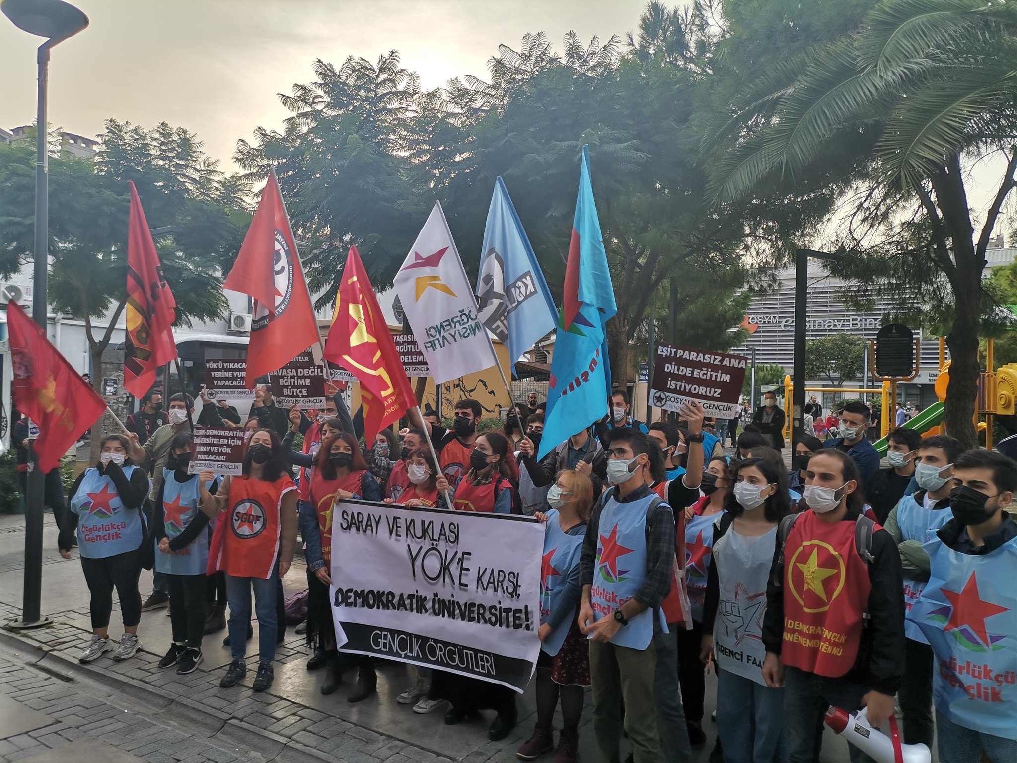 İzmir’de Alsancak ÖSYM önünde buluşan üniversiteli gençlik örgütleri burada bir basın açıklaması yaparak YÖK’ün kurulduğu günden bugüne üniversitelerin toplum için bilimsel bilgi üreten kurumlar olmasını sağlamak yerine muktedirlerin ideolojik kuklası olarak hareket ettiğini ve bugün de üniversitelerin asıl sahibi öğrencilere karşı açık bir politik savaş yürüttüğünü söyledi.