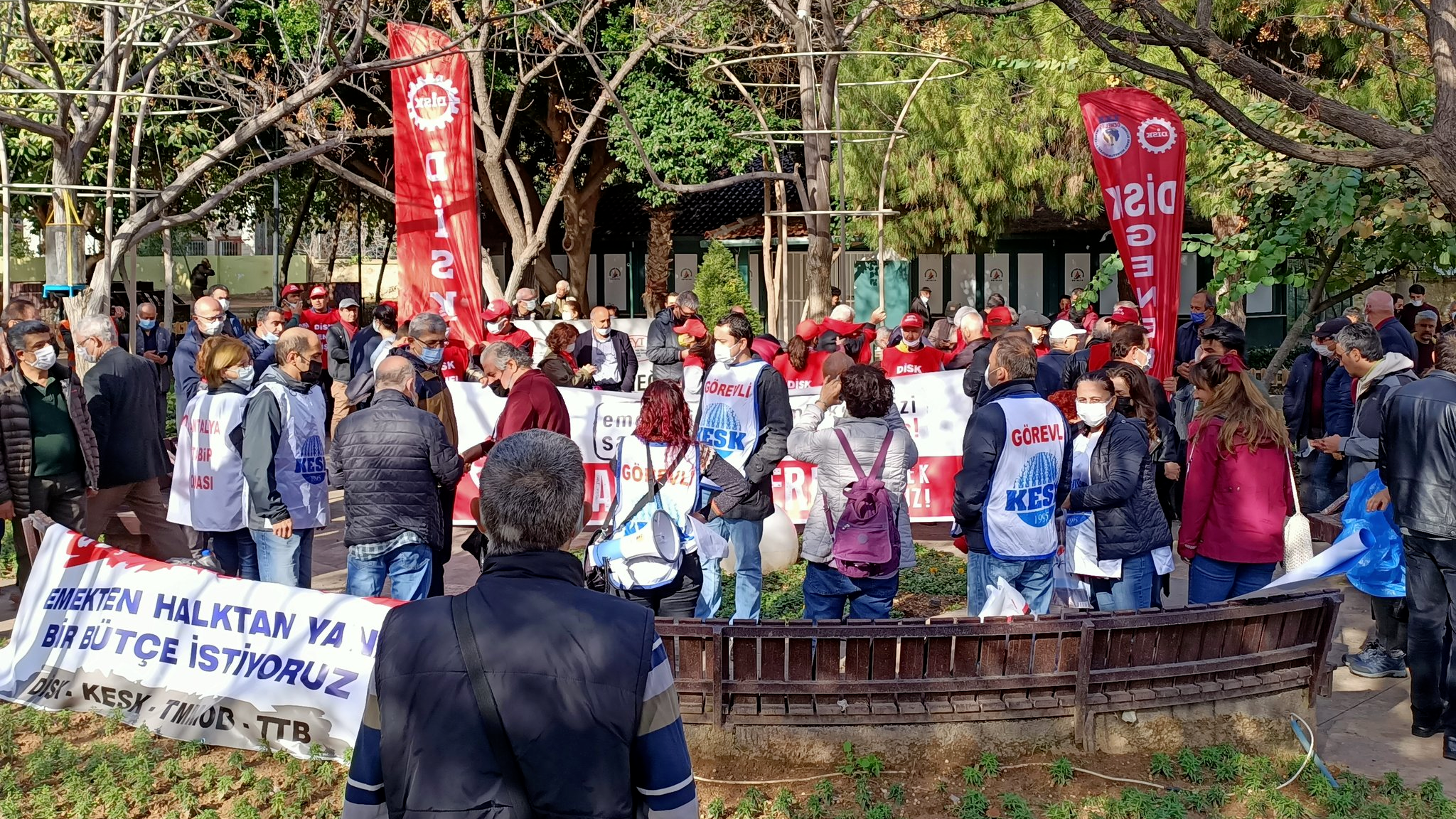 Antalya’da DİSK, KESK, TMMOB ve TTB Antalya’da “Emekten, halktan yana bütçe istiyoruz” diyerek miting çağrısı yapmıştı. Ancak Muratpaşa Kaymakamlığı mitingi yasaklamıştı. Aydın Kanza Parkı’nda toplanılmasının ardından Cumhuriyet Meydanı’na yürüyüş olacaktı. Yasağa rağmen Aydın Kanza Parkı’nda toplanan emek ve demokrasi güçleri, eylemlerini parkın içinde sürdürdü.