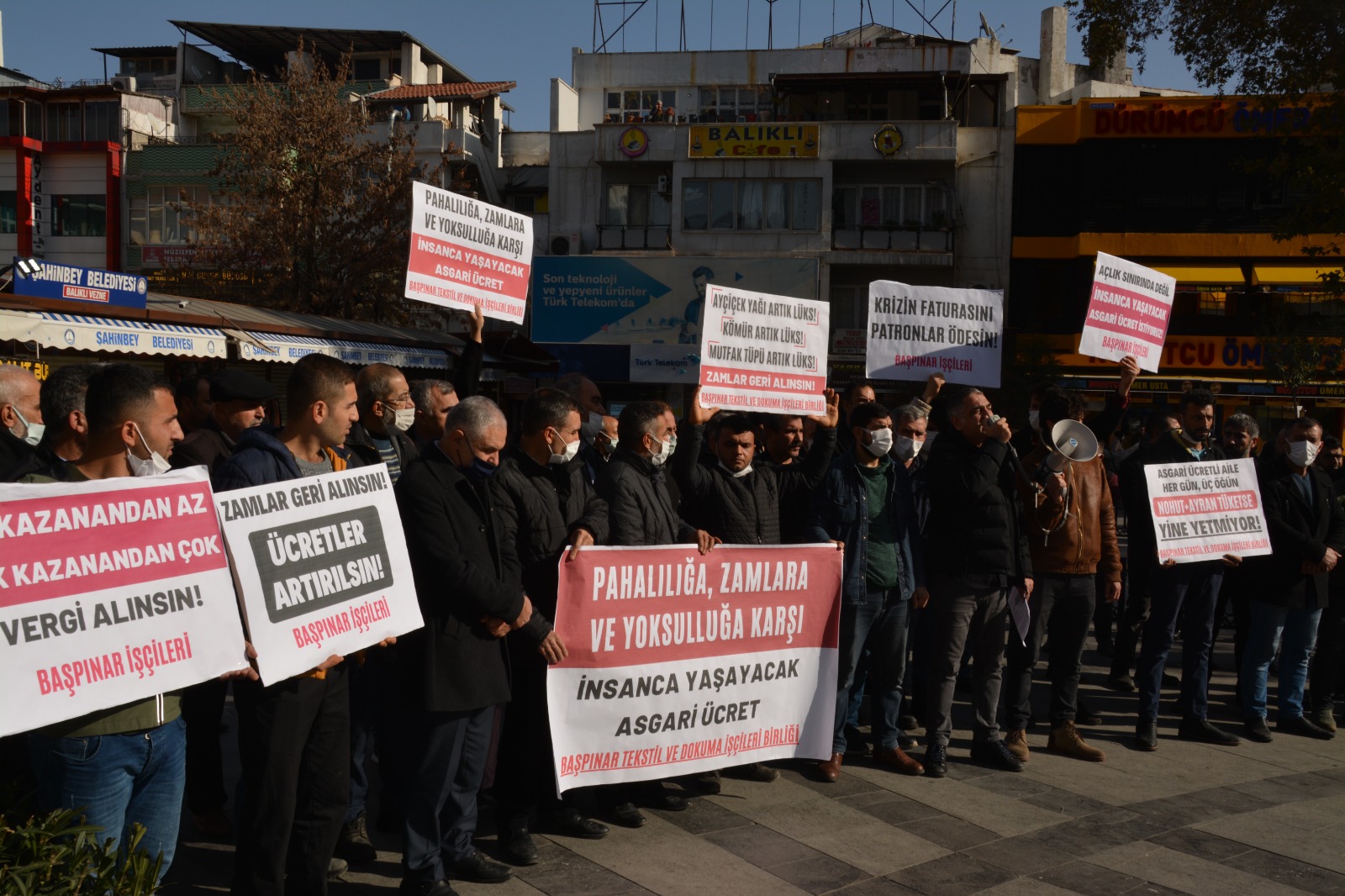 Buradan 200 bin işçinin çalıştığı Başpınar Organize Sanayi Bölgesi işçileri olarak hükümete, patronlara ve bu kadar zamma rağmen 4 bin lira gibi komik bir rakam telaffuz eden, işçiler adına o masaya oturduğunu söyleyen Türk-İş başkanına sesleniyoruz. Yüzde 60’ı aşan enflasyon düzeyini ve son bir yılda dolar karşısındaki erimeyi telafi edecek bir oranın altında zam yapılırsa bunu kesinlikle kabul etmeyeceğimizi ilan ediyoruz. Buradan bütün Başpınar işçilerine, bütün işçi kardeşlerimize, Antepli işçi ve emekçilere sesleniyoruz. Kaderimizin ve hayatımızın bir avuç patronun, tuzu kuru bakanların ve tuzu kuru sarı sendikacıların iki dudağı arasında olmasına artık yeter diyoruz.