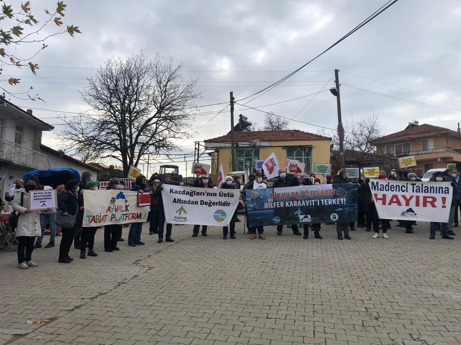 Bugün (17 Aralık) Karaayıt Köyü’nde toplanıp maden alanına yürüyenler basın açıklaması yaptı. Ayvalık Belediyesi, Ayvalık Tabiat Platformu, Kazdağı Doğal ve Kültürel Varlıkları Koruma Derneği, Ekoloji Birliği, Kazdağı Ekoloji Platformu, Ayvalık Demokrasi Platformu, Bergama Çevre Platformu, Ege Çevre ve Kültür Platformu, Bağımsız Maden İşçileri Sendikası, Dikili Çevre ve Kültür Platformu, Burhaniye Çevre Platformu ve köy halkı açıklamaya katıldı.