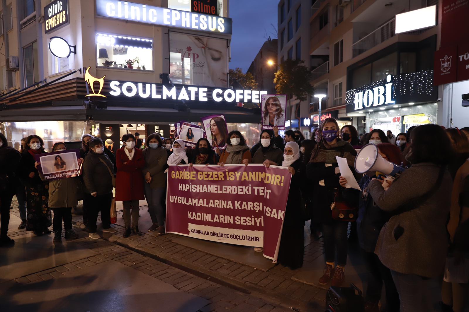 İzmir Kadınlar Birlikte Güçlü’nün çağrısıyla Alsancak’ta bulunan Türkan Saylan Kültür Merkezi önünde bir araya gelen kadınlar “Garibe Gezer isyanımızdır! Hapishanelerdeki tecrit uygulamalarına karşı tutsak kadınların sesiyiz” yazılı pankart açtı. Açıklamalarında “Edi bese (Artık yeter)” sloganları ile alanda olduklarını belirten kadınlar, “Sesimiz duyulsun, gerçekler su yüzüne çıksın istiyoruz. Hepimiz Garibeyiz bugün. Garibe olarak sesleniyoruz herkese” dedi.