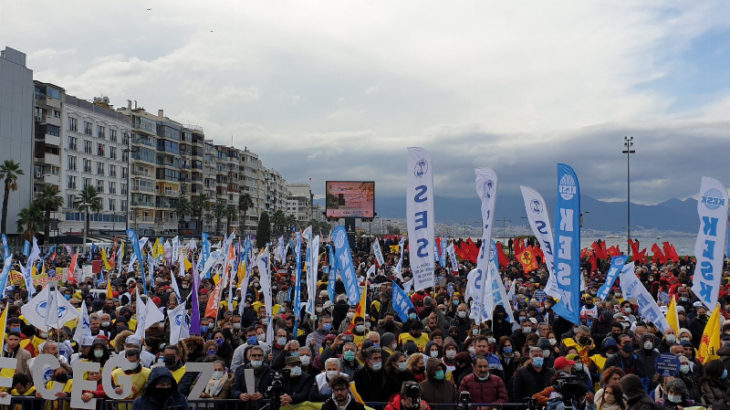 Kamu Emekçileri Sendikaları Konfederasyonu’nun (KESK) çağrısıyla binlerce kişi “Geçinemiyoruz” diyerek İzmir’de buluştu. Gündoğru Meydanı’nda düzenlenen miting öncesi, emekçiler Cumhuriyet Meydanı’nda toplanarak miting alanına yürüdü. Mitingde, kamu emekçilerinin vergi adaletsizliğinin son bulması, 3600 ek gösterge ile ilgili düzenlemenin bir an önce hayata geçirilmesi, kamudan ihraç edilenlerin derhal göreve iade edilmesi, insanca yaşayabilecek temel gelir güvencesinin sağlanması temel talepler arasında yer aldı. Mitinge çevre illerden de yogun katılım gerçekleşti.