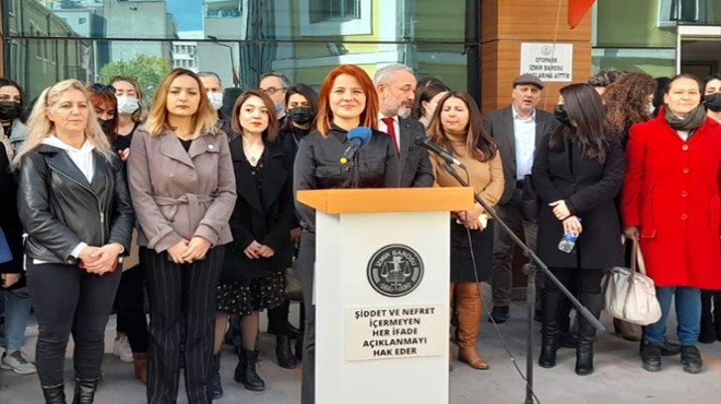 Açıklama öncesi konuşan İzmir Barosu Başkanı Özkan Yücel, “Kendi ülkesinde kendi kanunlarını tanımayan devlet büyüklerinin ülkesinde yaşıyoruz. Kanunlara uyumamaya teşvik eden sorumlular ve bunlar hakkında harekete geçmeyen yargı mensupları” diyerek Erdoğan’ın sözlerini eleştirdi.