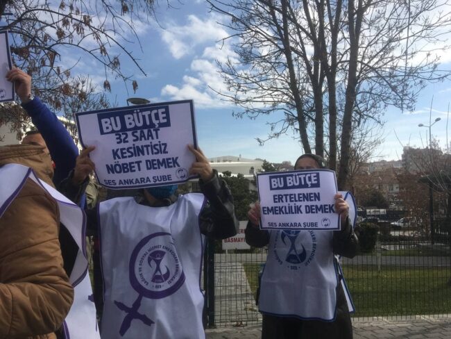 Ankara’da çeşitli hastanelerde iş bırakan sağlık emekçileri, Sağlık ve Sosyal Hizmet Emekçileri Sendikası (SES) Ankara Şubesi’nin çağrısıyla Ankara Eğitim ve Araştırma Hastanesi’nde toplandı. Eyleme Ankara Tabip Odası ve Dev Sağlık İş üye ve yöneticileri de katıldı.