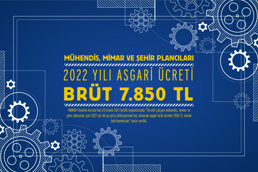 TMMOB Yönetim Kurulu’nun 20 Aralık 2021 tarihli toplantısında ücretli çalışan mühendis, mimar ve şehir plancıları için 2022 yılı ilk işe giriş bildirgesinde baz alınacak asgari brüt ücretin 7.850 TL olarak belirlenmesine; odalarınca belgeli çalışmanın koşul olduğu uzmanlık alanlarında, mesleki deneyimin arandığı alanlarda, şantiye şefliği, sorumlu müdürlük, iş güvenliği uzmanlığı, yapı denetim elemanı, daimi nezaretçi, uzak yol kaptanlığı vb. hizmetlerde asgari ücret uygulanmayacağını, bu durumda olan mühendis, mimar, şehir plancılarının ücretlerinin alınan sorumluluk gereği belirlenen asgari ücretinin üzerinde olmasına karar verildi.