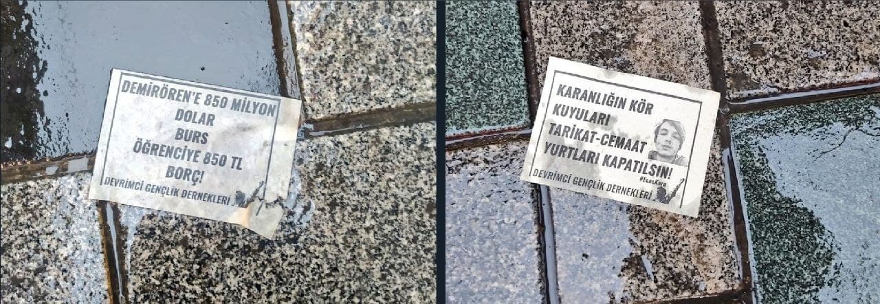 Devrimci Gençlik Dernekleri, sosyal medya hesabında cemaat yurdunda hayatına son veren Enes Kara için Beyoğlu’nda İstiklal Caddesi üzerinde bulunan Demirören AVM’den yaptıkları kuşlamayı paylaştı. Ardından arkadaşlarının gözaltına alındığını şöyle duyurdu: