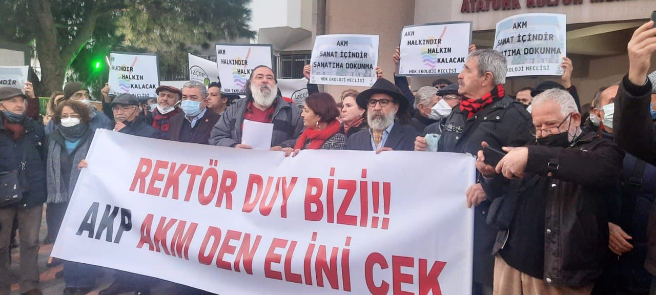 AKM önündeki açıklamayı İzmir Tiyatroları Derneği Başkanı Özgür Başkaya okudu. Yapılan açıklamada konunun gündeme gelmesinin ardından ortaya atılan iddia hakkında Ege Üniversitesi Rektörlüğü’nün, Valilik, Emniyet Müdürlüğü’nün açıklama yapması istendiği ancak bu taleplerin cevapsız bırakıldığı ifade edildi. Açıklamanın sonunda ise geçici de olsa AKM’nin İzmir İl Emniyet Müdürlüğü’ne tahsis edilmesine karşı çıkıldığı vurgulandı.