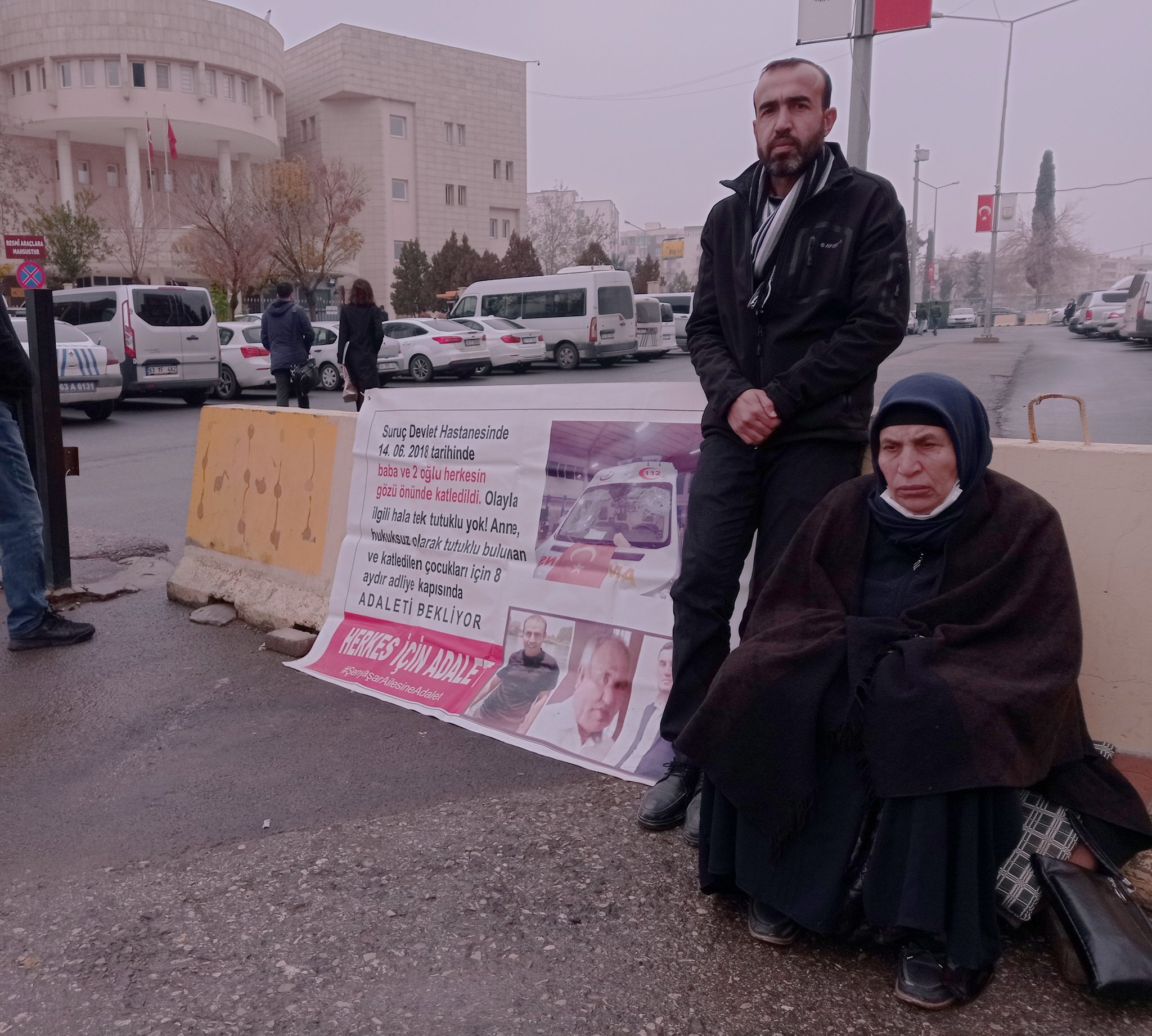 AKP Urfa Milletvekili İbrahim Halil Yıldız’ın koruma ve yakınlarının saldırısı sonucu eşi ve iki oğlunu yitiren Emine Şenyaşar ile saldırıdan yaralı kurtulan oğlu Ferit Şenyaşar’ın Urfa Adliyesi önünde 9 Mart’ta başlattığı Adalet Nöbeti 323’nci gününde devam ediyor.