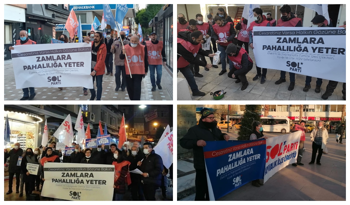 BirGün’ün haberine göre, Samsun, Antalya, Ankara ve Ayvalık’ta bir araya gelen SOL Partililer, “AKP iktidarı yeni yıla girerken elektrik ve doğalgaz başta olmak üzere yaptığı zamlarla milyonların yeni yıla daha da yoksullaşarak girmesine sebep oldu. Enerji şirketlerini zenginleştirip, halkı yoksulluğa, karanlığa iten bu iktidar bir an evvel ülkenin başından defedilmelidir” dedi.