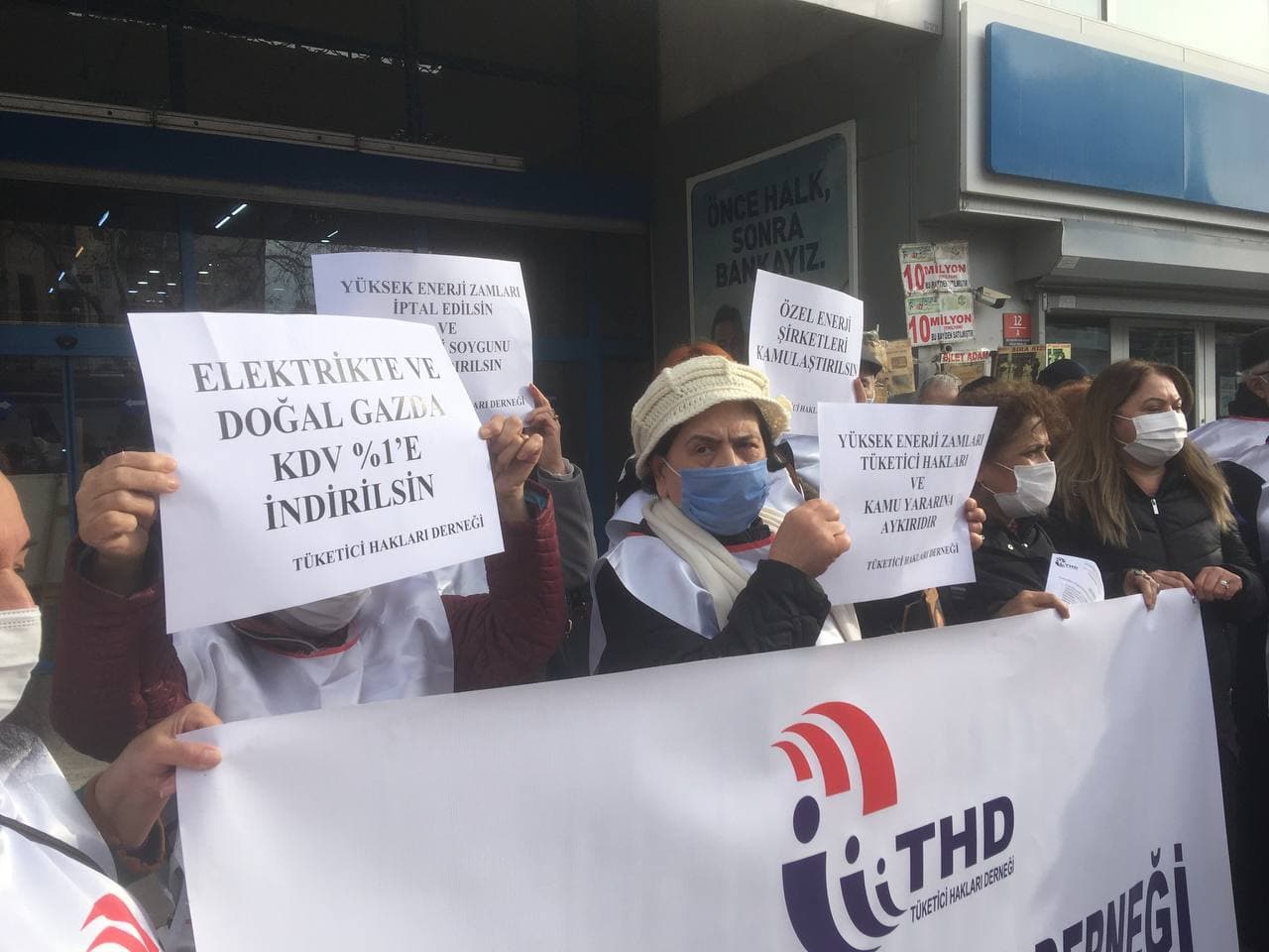 Tüketici Hakları Derneği (THD), yeni yılda gelen zamlara karşı eylem yaptı. Ankara’da Gazi Mustafa Kemal Bulvarı üzerindeki THD Genel Merkezi önünde yapılan eylemde “Enerjide tüketiciler soyulacak, şirketler kazanacak” denilerek zamların geri alınması ve diğer talepler dile getirildi.