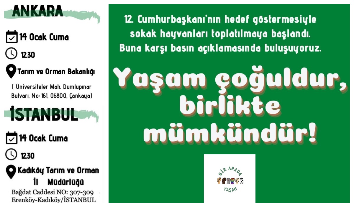 #İSTANBUL📍14 Ocak Cuma 12.30da Tarım ve Orman İl Müdürlüğü önünde #BirAradaYaşam Kampanya Grubu olarak sokak hayvanlarına yönelik linç kampanyasına karşı basın açıklaması gerçekleştireceğiz. Herkesi bekliyoruz@aslialpar @bur_hak @vegvorous @apeironur @hakim_komite @vegan__earth pic.twitter.com/z4YWEvvYJM