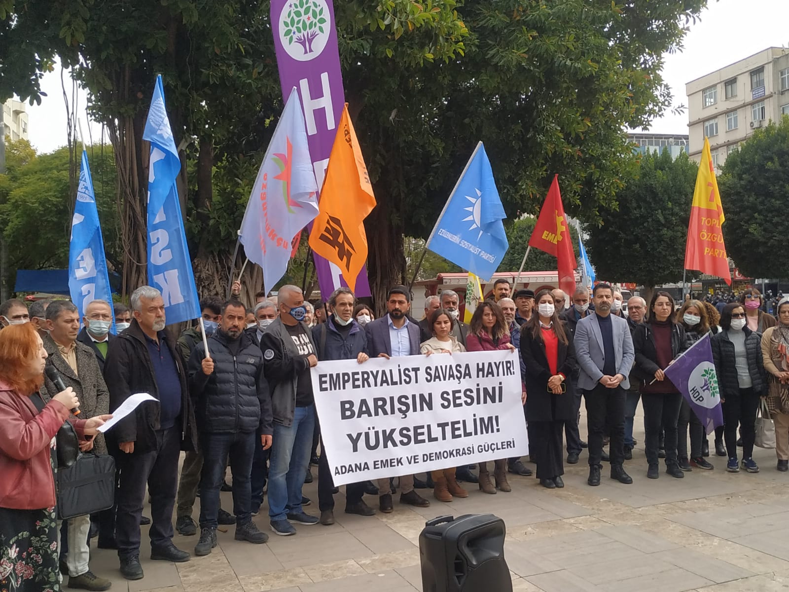Adana Emek ve Demokrasi Güçleri, Rusya-Ukrayna savaşına karşı “Emperyalist savaşa karşı barışın sesini yükseltelim” diyerek bir araya geldi. Yapılan açıklamada “Rusya, egemen bir ülke olan Ukrayna’ya yönelik saldırı ve işgalini derhal sonlandırmalıdır. Halkların kendi kaderini tayin hakkı kabul edilerek sorunlar diyalog ve barış ile çözülmelidir” denildi