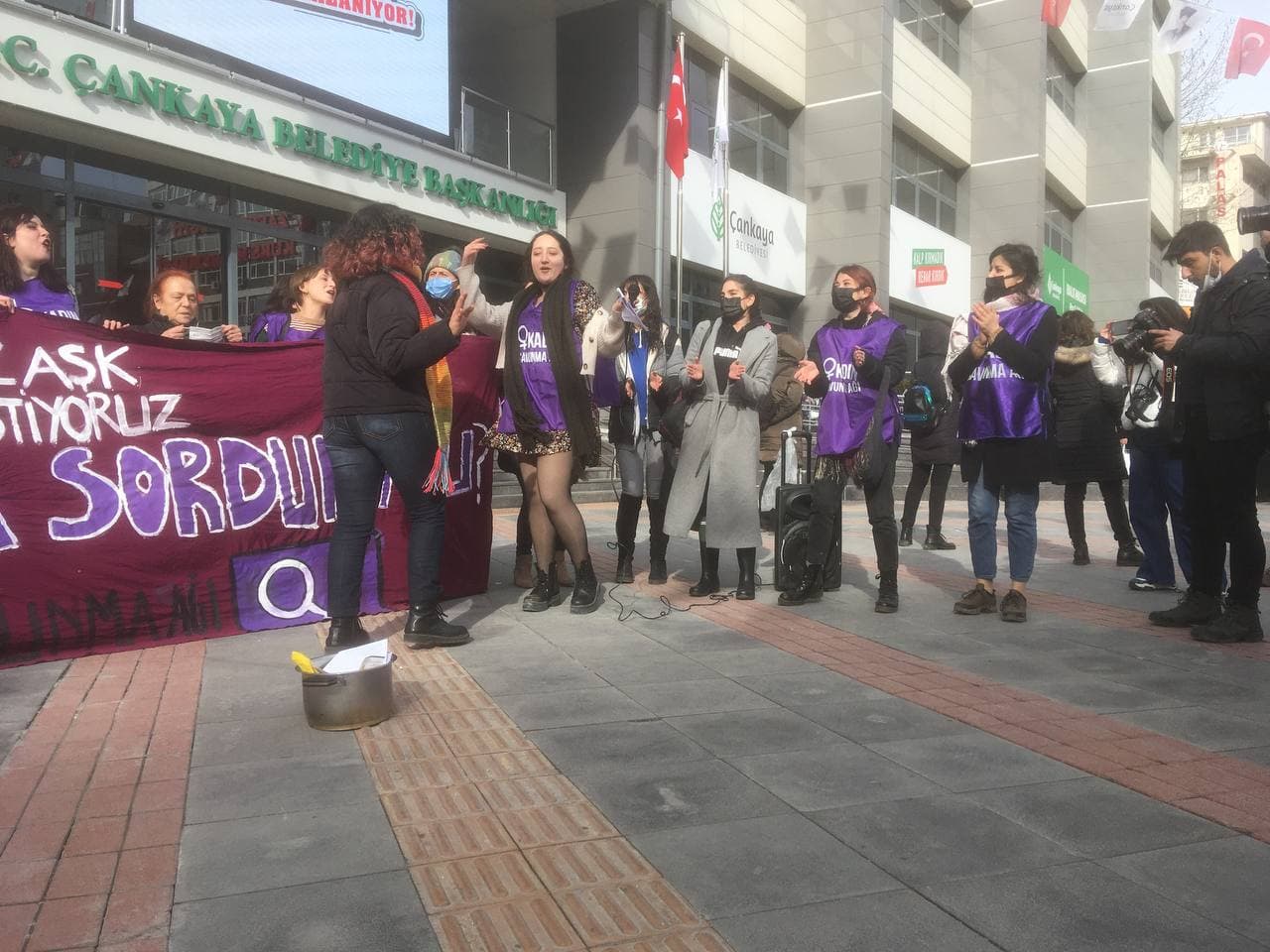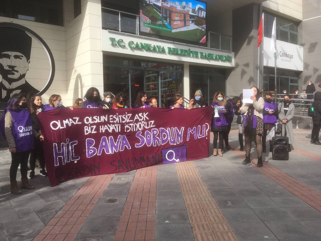 14 Şubat Sevgililer Günü öncesinde Ankara’da Kadın Savunması, “Aşk eski bir yalan Adem’le Havva’dan kalan! Dünyayı değiştireceğiz dedikçe bizi şiddetle kendi sınırlarına, kendi aşk anlayışına hapsetmeye çalışan erkek egemenliğine karşı sokaktayız” diyerek Çankaya Belediyesi önünde buluştu. İlişkilerde yaşanan şiddete, erkek egemen aşk anlayışına tepki gösteren kadınlar bir açıklama yaptı. Kadın Savunması’nın çağrısı üzerine etraftaki kadınların da bir kısmı eyleme katılırken bir kısmı alkışlarıyla destek oldu.