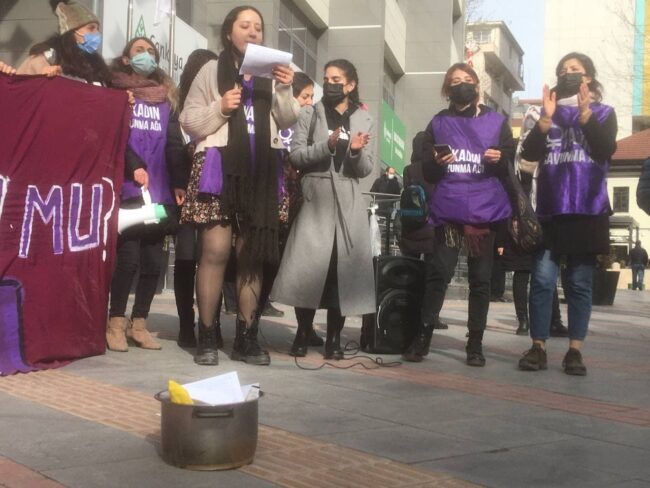 Kadnlar açıklamanın ardından kendilerine dayatılan rolleri, ev işlerini, faturaları kabul etmediklerini söyleyip bunların simgelerini pankartın önüne kurdukları “cadı kazanında” kaynattılar.