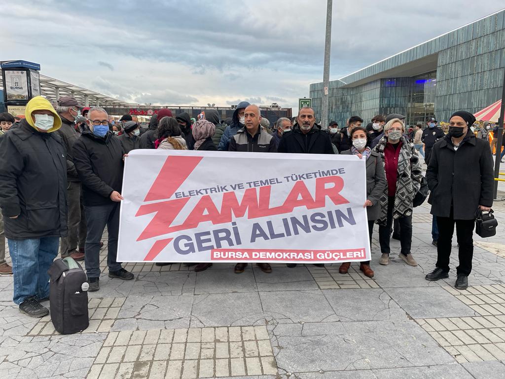 Bursa Demokrasi Güçleri, son dönemde elektrik ve doğalgaza yapılan zamlar için Kent Meydanı önünde basın açıklaması yaptı