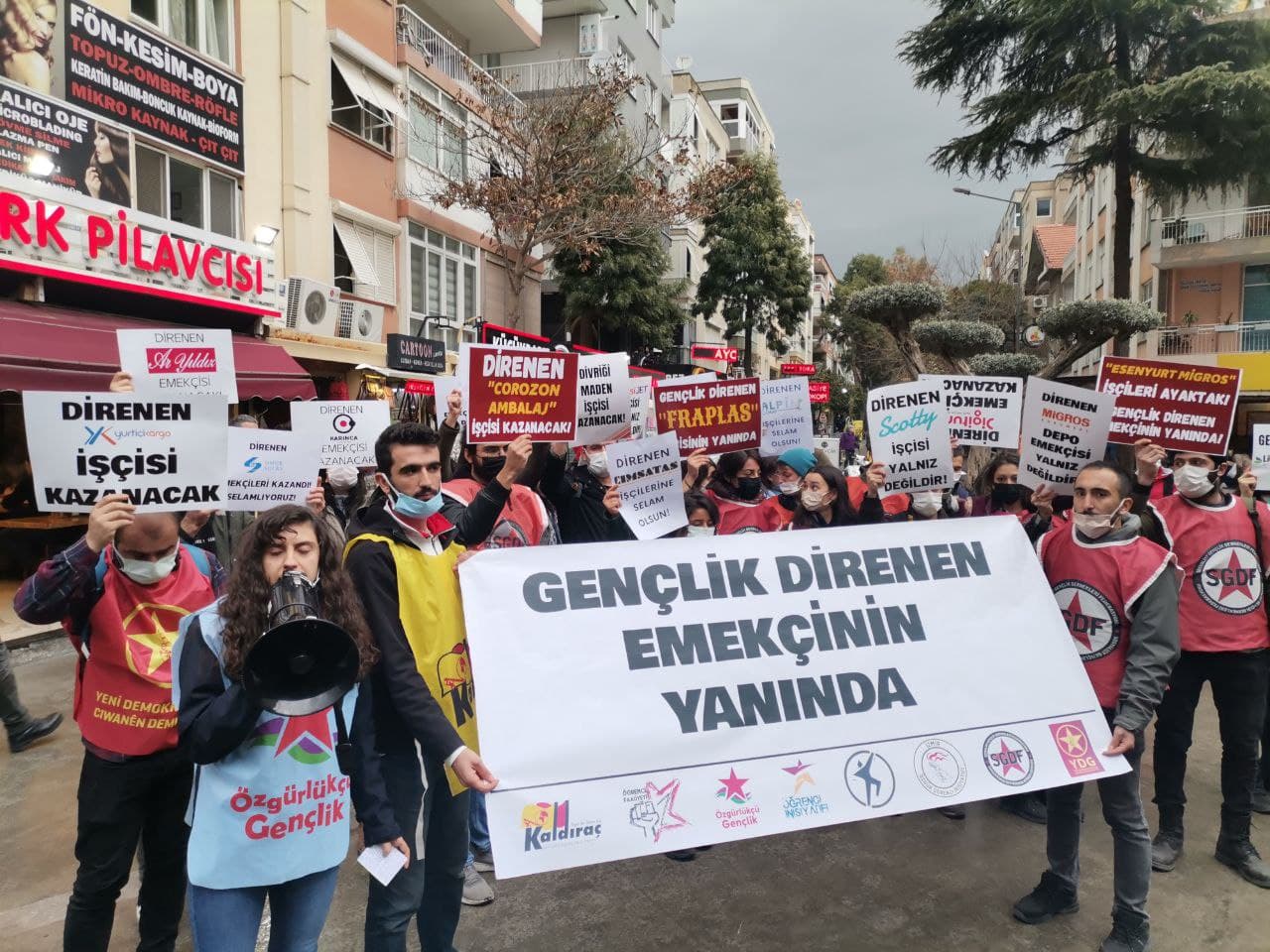 İzmir’de gençlik örgütleri Bornova’da direnen işçiler için yürüyüşlerinin ardından açıklama yaptı. Açıklamada şunlar söylendi: