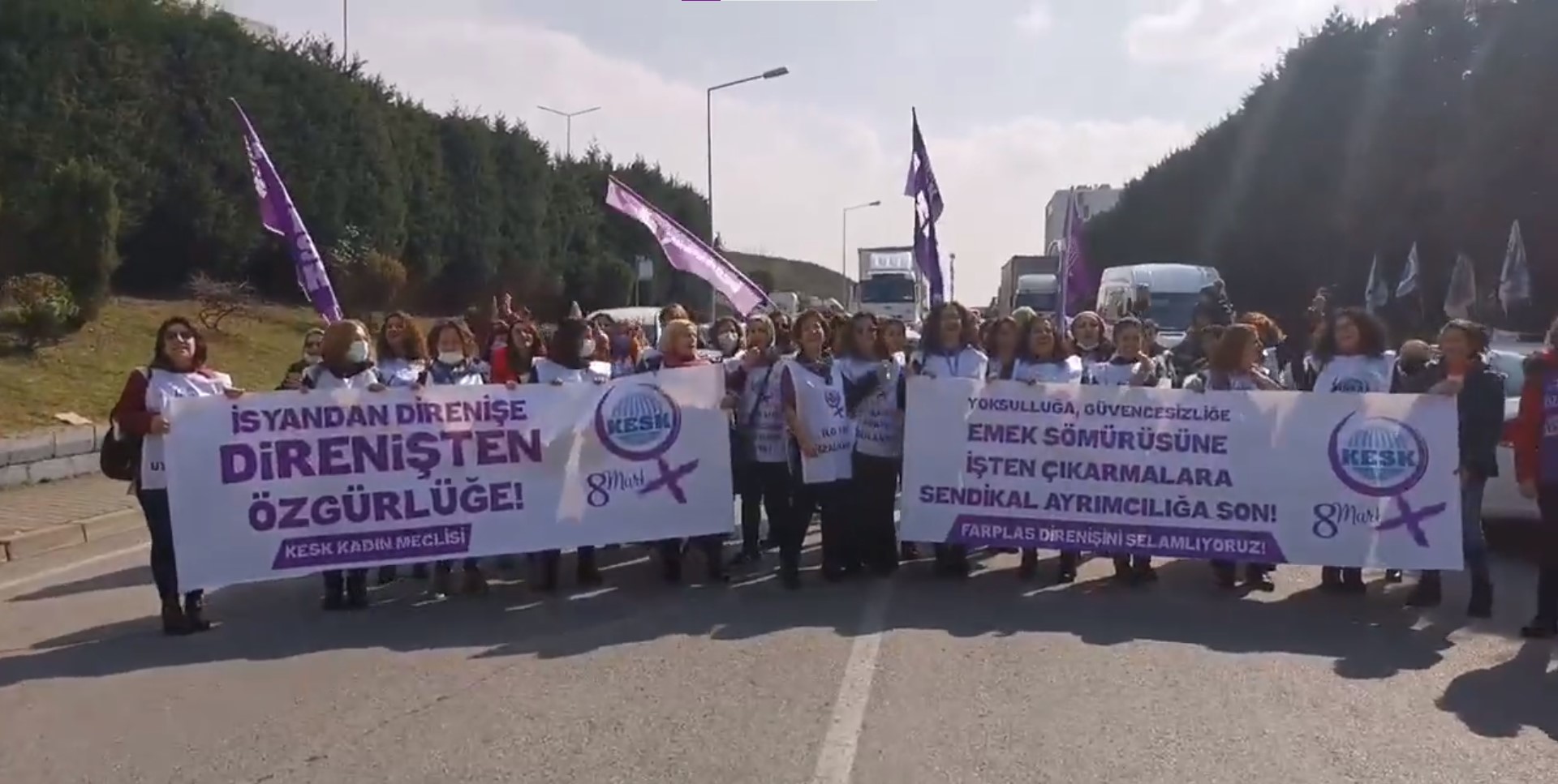 Kadınlar ellerinde “İsyandan direnişe, direnişten özgürlüğe” ve “Yoksulluğa, güvencesizliğe, emek sömürüsüne, işten çıkarmalara, sendikal ayrımcılığa son! Farplas direnişini selamlıyoruz” yazılı pankartlar ile fabrika önüne yürüdü.