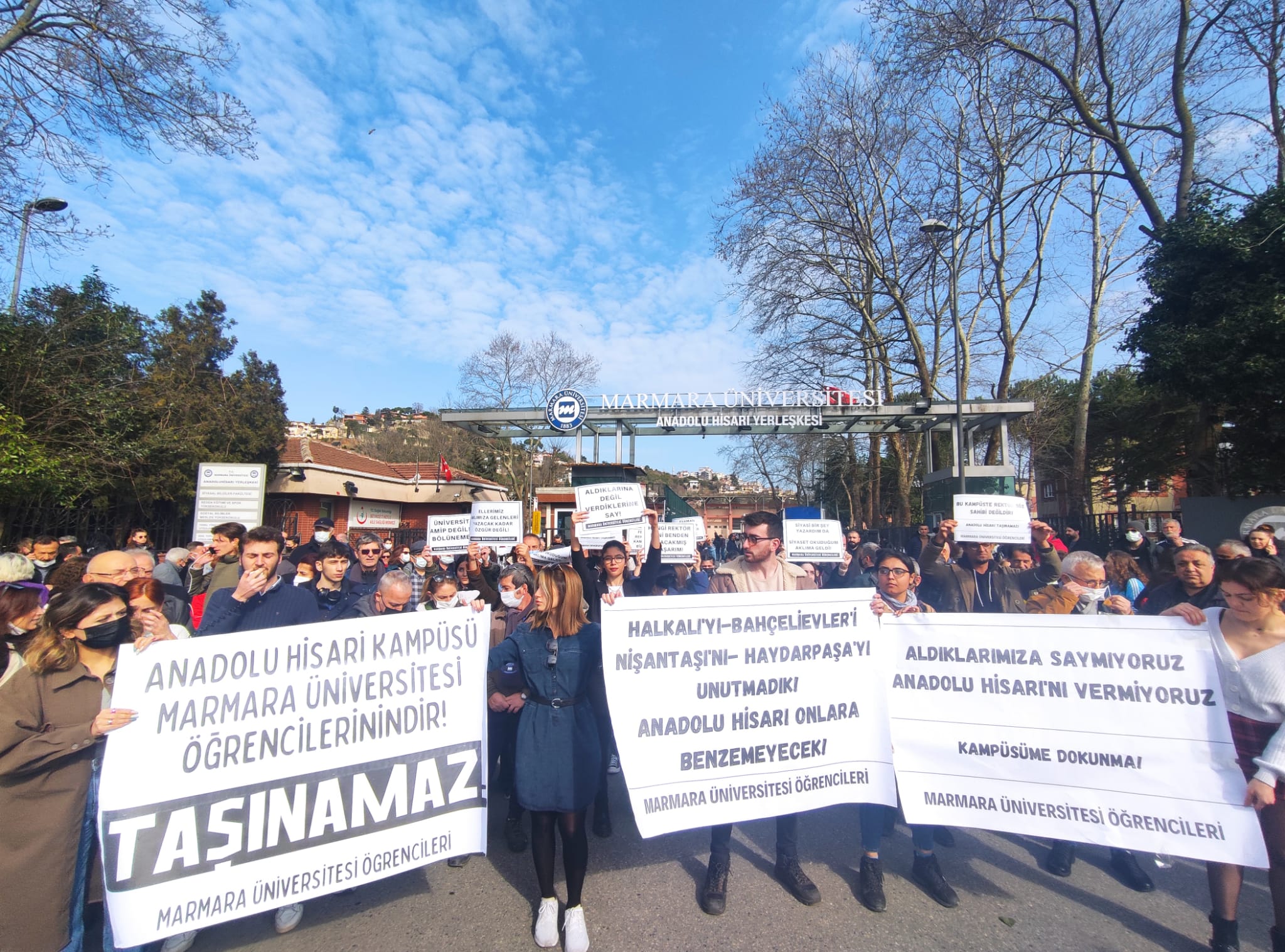 Marmara Üniversitesi öğrencileri, mezunları, akademisyenleri “Anadolu Hisarı Kampüsü Marmara Üniversitesi öğrencilerinindir” diyerek kampüsleri önünde bir araya geldi