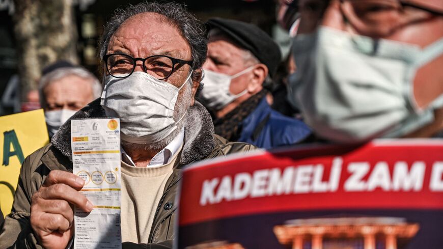 Elektrik faturasını gösteren bir protestocu 11 Şubat 2022 – OZAN KOSE/AFP via Getty Images