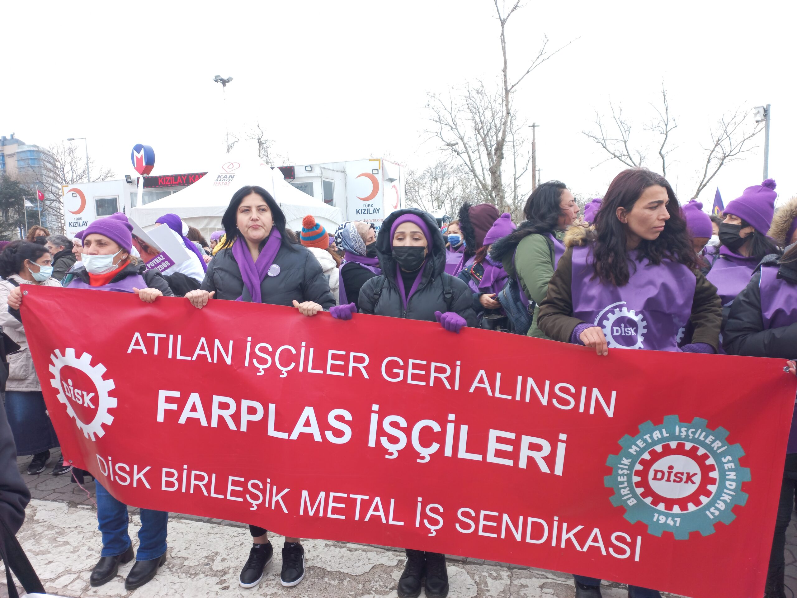 Patronu da bir kadın olan ve Kocaeli’de faaliyet yürüten Farplas fabrikasında sendikalı oldukları için işine son verilen 200’ün üzerinde kadın işçinin de bulunduğu fabrika önünde 8 Mart günü DİSK Genel Başkanı Arzu Çerkezoğlu ve DİSK Kadın Komisyonu’ndan kadınlar saatlerce yağmur altında işçi ve sendika düşmanlığını protesto ettiler. Taleplerin kabul edilmesi için çeşitli sloganlar haykırıp halay çektiler. Haklarımızı-hayatlarımızı koruyacağız dediler.