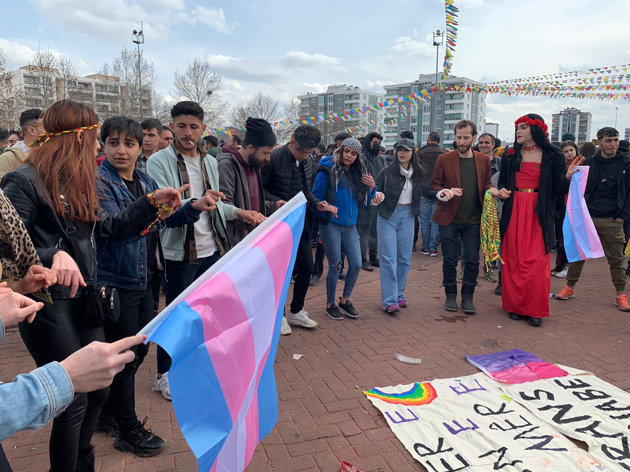 Diyarbakır’daki Newroz mitinginde LGBTİ+’lar saldırıya uğradı. “Bê trans jîyan nabe” ve “Şer şer e çi jin e çi mêr e” pankartları, gökkuşağı ve trans bayraklarıyla Newroz alanında yer alan LGBTİ+’ları; bir grup erkek bıçakla tehdit etti.